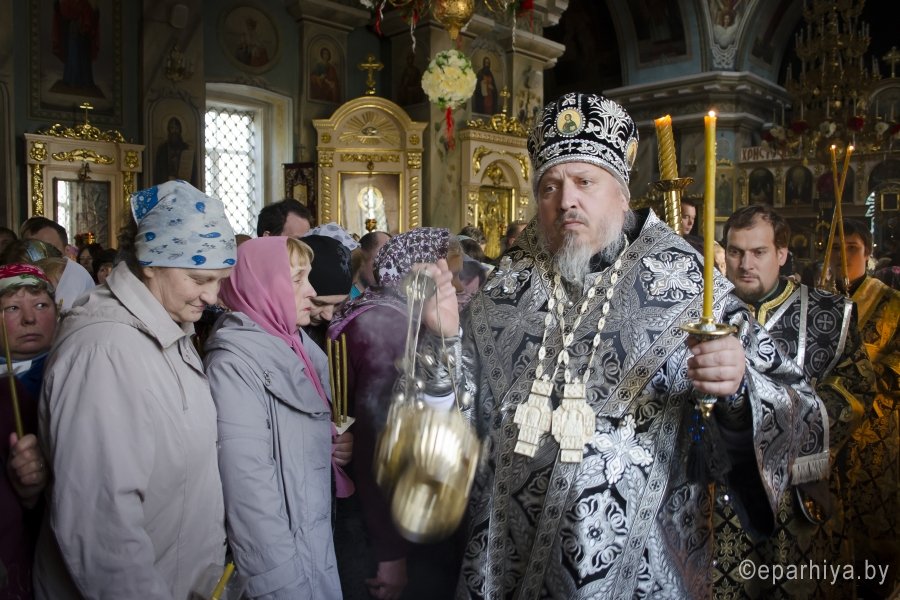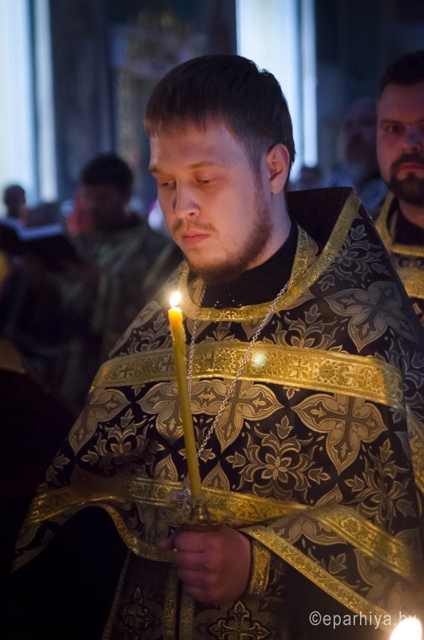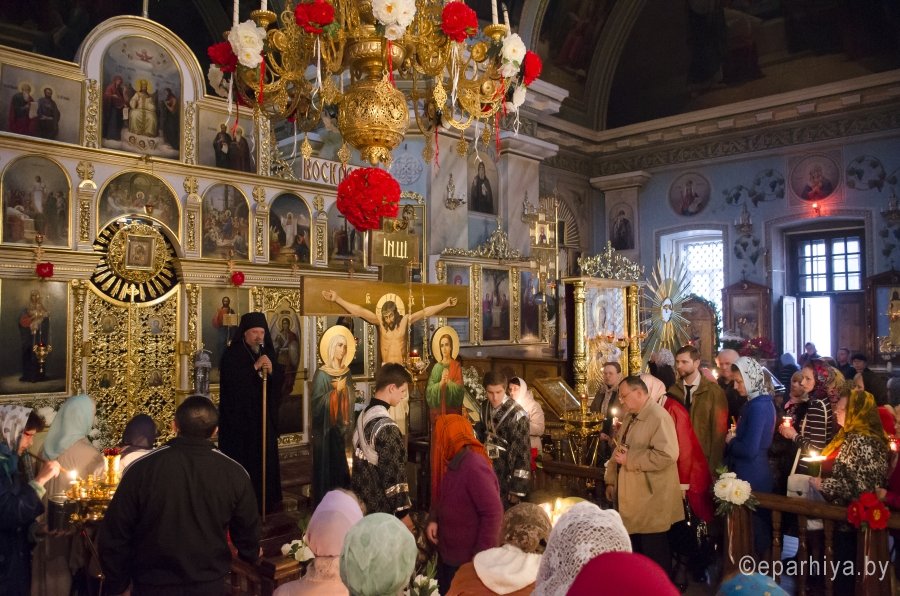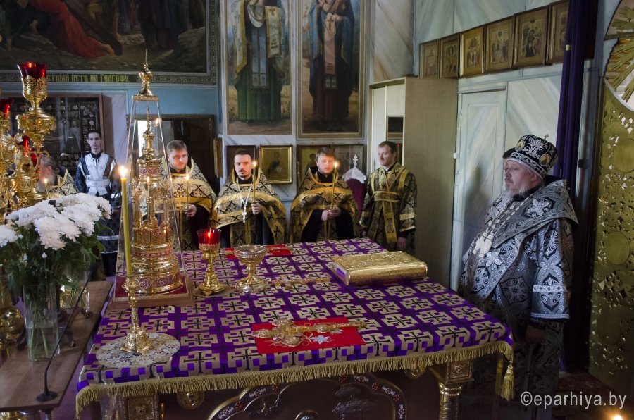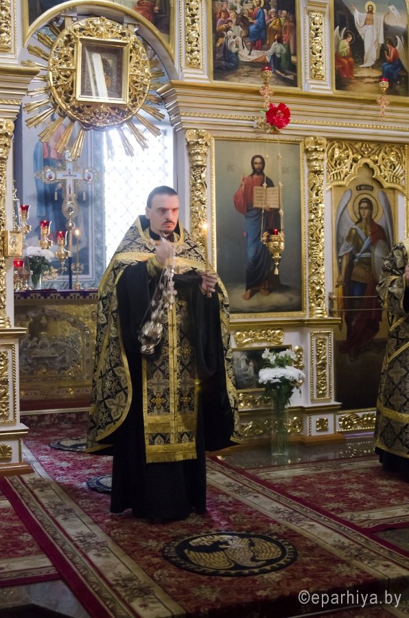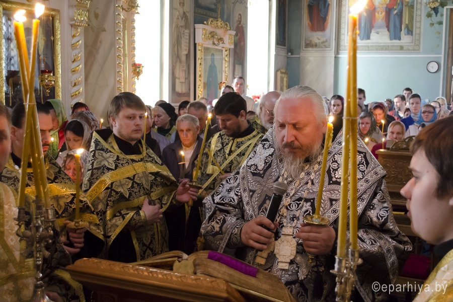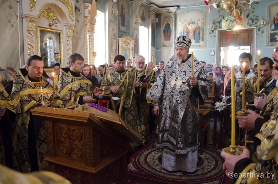 28 апреля 2016 года, в канун Великого Пятка, дня воспоминания Святых спасительных Страстей Господа нашего Иисуса Христа, Преосвященный Стефан, совершил утреню с чтением 12-и Страстных Евангелий в Свято-Петро-Павловском кафедральном соборе г.Гомеля. Преосвященному сослужили: секретарь Гомельской епархии протоиерей Георгий Алампиев и духовенство собора. По окончании богослужения Владыка обратился к духовенству и молящимся со словами Архипастырского назидания. |
