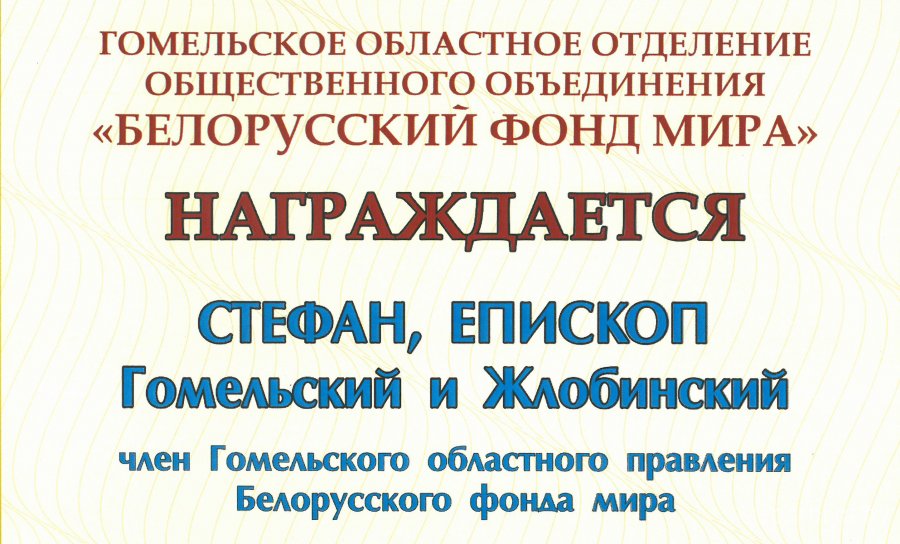 4 мая 2016г. в честь 55-летия со Дня образования Белорусского фонда мира Преосвященнейший Стефан, епископ Гомельский и Жлобинский, входящий в состав Гомельского областного правления Белорусского фонда мира, за участие в благотворительной деятельности, помощь инвалидам войны и труда, многодетным семьям, детям, был награжден юбилейной почетной грамотой ОО "Белорусский фонд мира". |