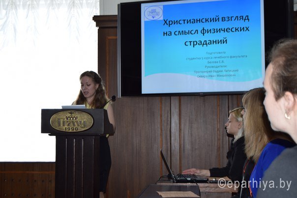 4 мая 2016 г. в рамках сотрудничества между Министерством здравоохранения и Белорусской Православной Церковью в учреждении образования «Гомельский государственный медицинский университет» (ГГМУ) прошли очередные научно-образовательные чтения «Актуальные проблемы биоэтики: взгляд медицины и Церкви». Организаторами чтений выступили Гомельская епархия, кафедра общественного здоровья и здравоохранения ГГМУ, а также молодежное братство православных медиков в честь преп. Манефы Гомельской. С приветственным словом к участникам Чтений обратился проректор по учебной части УО «ГГМУ» А.А. Козловский. Он отметил важность духовно-нравственного воспитания будущих врачей, и подчеркнул значимость тематики подготовленных докладов. На Чтениях обсуждались такие актуальные для современности темы как нравственные вопросы относительно суррогатного материнства и донорства органов, адаптация пациента к последнему диагнозу, эмоциональное выгорание у медицинских работников, нравственное воспитание будущих медиков, значение традиционных религиозных ценностей и др. В работе Чтений принимали участие заведующий научно-исследовательским сектором, кандидат медицинских наук, доцент Е.В. Воропаев, ассистент кафедры онкологии В.В. Похожай, ассистент кафедры внутренних болезней О.Н. Кононова. Среди слушателей были также студенты и преподаватели из УО «Гомельский государственный медицинский колледж». На Чтениях присутствовали и участвовали в обсуждениях и представители духовенства епархии. Ставшие традиционными в стенах ГГМУ ежегодные христианские Чтения служат продуктивной площадкой для обмена информацией, мнениями и опытом из области христианской веры, биоэтики и медицины между участниками Чтений - учеными, преподавателями и студентами-медиками, представителями православного духовенства и работниками здравоохранения из разных городов нашей республики, а также представителей из ее ближайших странСНГ (России и Украины). |