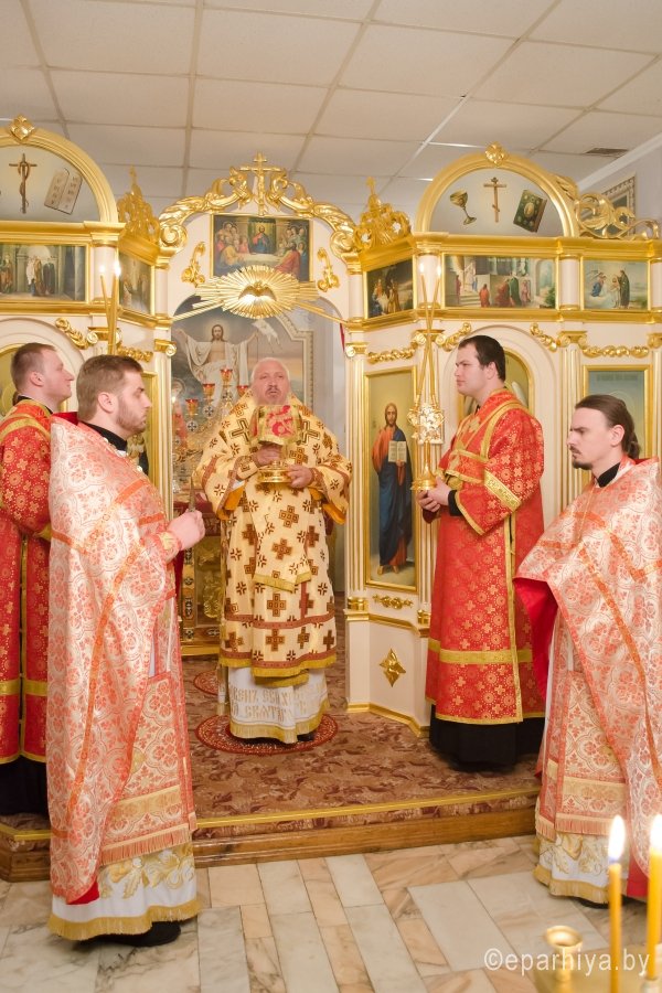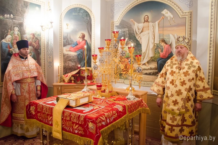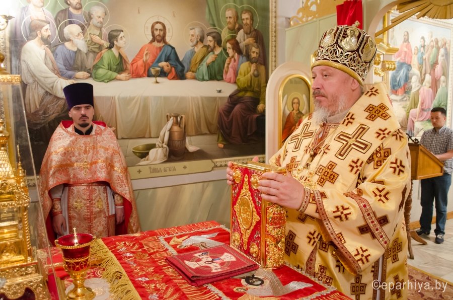 30 мая 2016г., в понедельник 5-й седмицы по Пасхе, Преосвященнейший Стефан, в сослужении духовенства собора, возглавил Божественную литургию в криптовом храме Свято-Петро-Павловского кафедрального собора г.Гомеля. По окончании богослужения Владыка поздравил причастников с принятием Святых Христовых Таин и преподал всем архипастырское благословение. |