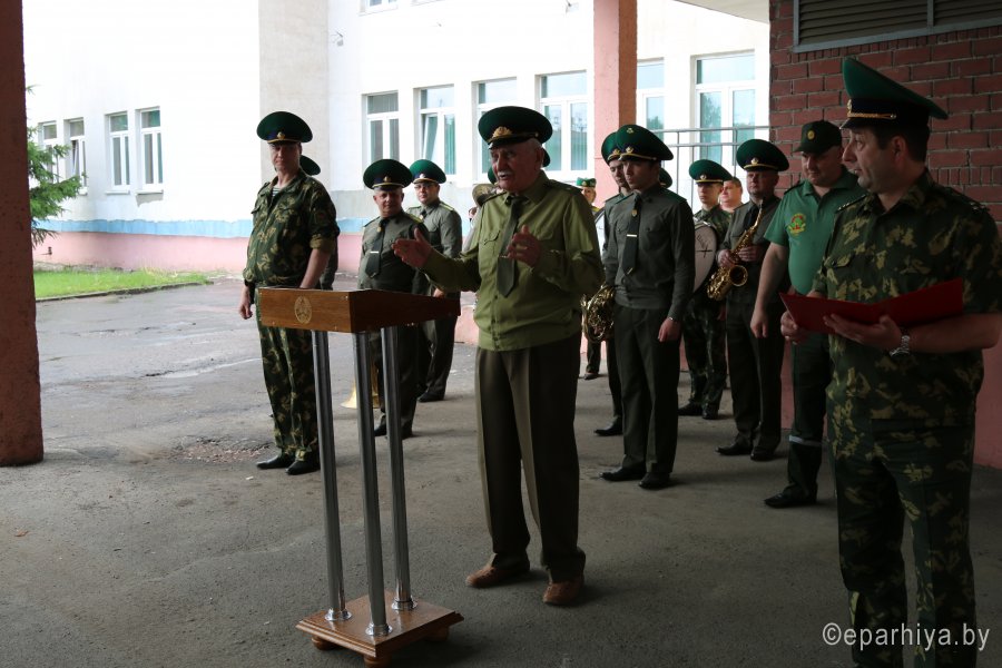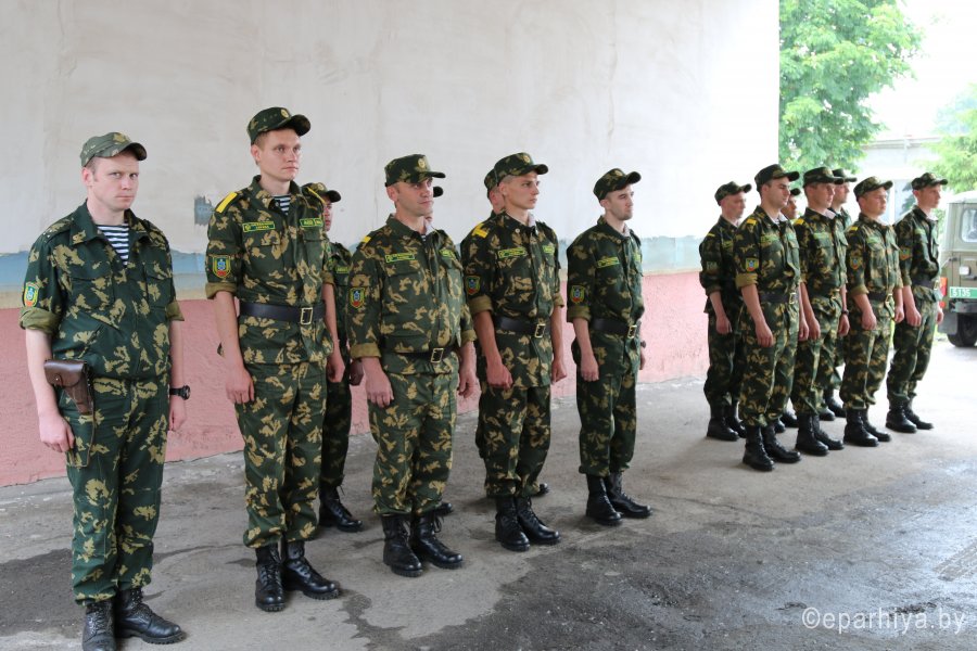 31 мая 2016 года на площадке под Государственным флагом на территории воинской части Гомельской пограничной группы состоялось торжественное мероприятие – вручение боевого оружия военнообязанным запаса. Открыл торжественный митинг начальник Гомельской пограничной группы полковник Кузьменко А.В. От имени Гомельской епархии личный состав поприветствовал иерей Максим Новик, клирик храма святого Архангела Михаила в г.Гомеле. В завершении митинга он благословил личный состав погрангруппы, окропил святой водой, а также пожелал Божьей помощи в исполнении своего воинского долга. |