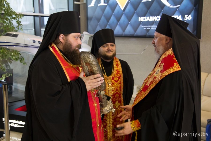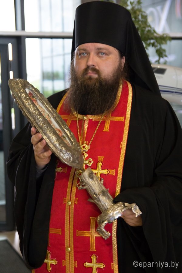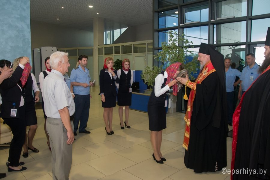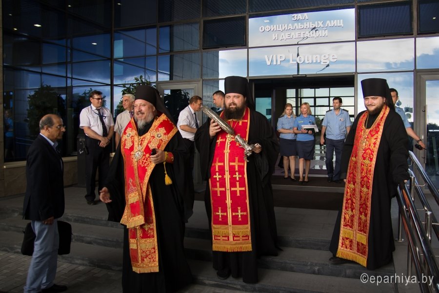 1 августа 2016г. в Национальный аэропорт «Минск» по благословению Святейшего Патриарха Московского и всея Руси Кирилла и Высокопреосвященнейшего Павла, Патриаршего Экзарха всея Беларуси, доставлена величайшая святыня - предплечье святого великомученика и целителя Пантелеимона. Святыню у трапа самолета встречал Преосвященный Стефан, епископ Гомельский и Жлобинский, наместник Свято-Никольского мужского монастыря г.Гомеля архимандрит Амвросий (Шевцов) и насельник монастыря архимандрит Савва (Мажуко). После молитвенного поклонения ковчег со Святыней в сопровождении Владыки Стефана направился в г.Гомель. |
