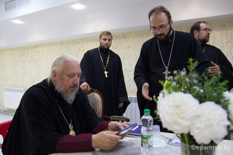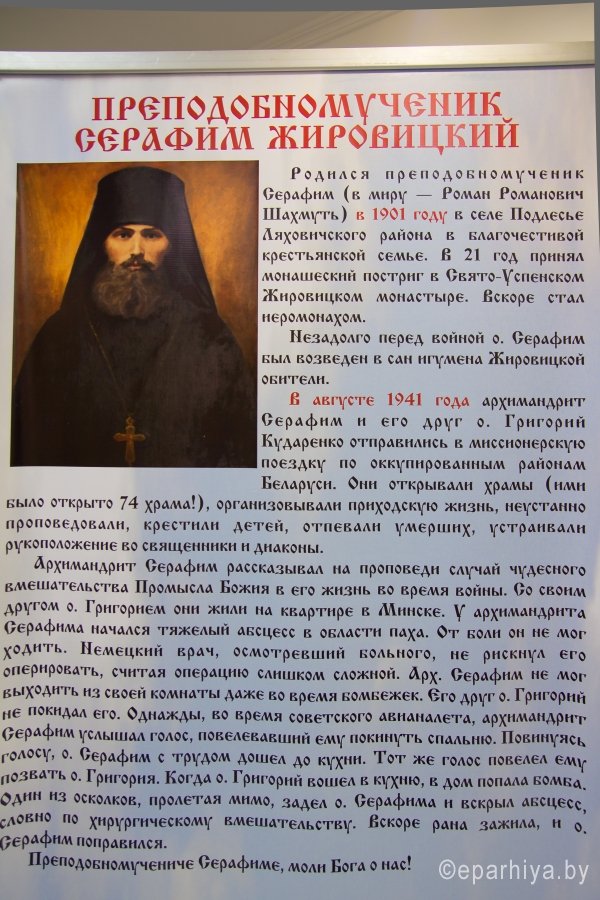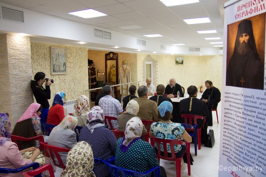11 сентября 2016 г. Преосвященный Стефан принял участие в вечере памяти преподобномученика Серафима (Шахмутя), который прошел в Свято-Петро-Павловском кафедральном соборе г. Гомеля. Имя преподобномученика Серафима (Шахмутя) тесно связано с историей Православной Церкви на Гомельщине. В 2016 г. исполняется 115 лет со дня рождения и 70 лет со дня мученической кончины преподобномученика Серафима Жировицкого (Шахмутя) (1901-1946). Во время немецко-фашистской оккупации Беларуси совершал миссионерское путешествие по территории восточной Беларуси во время которого посетил Гомельщину. В 1943 г. являлся настоятелем Свято-Петро-Павловского собора в г. Гомеле, открыл Ченский монастырь, где совершил постриг преподобной Манефы (Скопичевой) Гомельской. Открыл также ряд храмов на территории Гомельской епархии. |