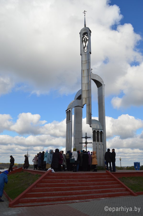 16 октября благочинным церквей Речицкого округа, настоятелем Свято-Успенского собора г. Речицы, протоиереем Алексием Пешко в сослужении клириков собора и при стечении множества прихожан был отслужен молебен с чином благословения и освящения новосооруженнаго креста в часовне Преподобной Евфросинии Полоцкой. Крест ранее установленный в часовне от времени начал разрушаться и было принято решение его заменить. На пожертвования прихожан Свято-Успенского собора был заказан, изготовлен и установлен 13 октября новый крест. Часовня возведена на высоком берегу Днепра в историческом месте - там, где в 1910 году остановилась процессия, следовавшая с мощами преподобной Евфросинии из Киева в Полоцк. 85 лет спустя, 2 сентября 1995 года здесь состоялось освящение часовни Благодатным Огнем от Гроба Господня, доставленным в Речицу научно-творческой экспедицией «Дорога к святыням», которая прошла путем возвращения из Святой Земли на родину святых мощей небесной покровительницы Белой Руси. Из нержавеющей стали и латуни по проекту лауреата Государственной премии Республики Беларусь уроженца Речицы Эдуарда Агуновича была выполнена ажурная, динамично-асимметричная конструкция высотой 24 м. Символика ее многогранна: четыре ступенчатые опоры образно представляют развитие жизни и мысли по спирали. В них снизу вверх, по возрастающей линии, вписаны лики 12 белорусских святых и просветителей. Мотивы арок, закомар ассоциативно возвращают зрителя к традициям древнерусского церковного зодчества. Венчает композицию ореол души Святой Евфросинии, держащей в руках крест, направленный в небо, т.е. к Богу. В центре часовни, между опорами, установлен крест из мореного дуба. С четырех сторон к памятнику ведут ступени, между ними разбиты цветочные клумбы. От подножия монумента открывается восхитительный вид на реку Днепр. |