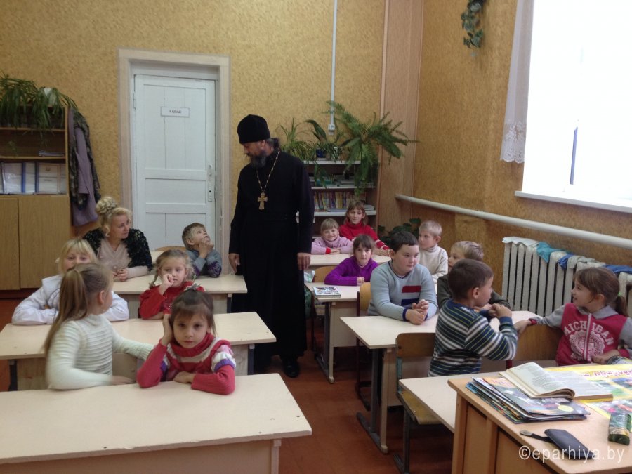 31 октября 2016 года в ГУО "Ленинский детский сад-базовая школа Добрушского района" состоялась встреча учеников 1-4 классов со священником. Про двунадесятые праздники осени и зимы рассказал ребятам протоиерей Василий Грек, настоятель храма Святителя Николая Чудотворца д. Поповка (Ленино) Добрушского благочиния. После занятия в школьном классе ребята вместе со священником и своими учителями Кныш Антониной Николаевной и Объезновой Татьяной Петровной совершили экскурсию в храм. Там они рассмотрели иконы праздничного ряда иконостаса, познакомились с устройством алтаря. Священнослужитель поведал школьникам о важнейшем христианском богослужении - Божественной Литургии. В завершение все желающие получили возможность подняться на колокольню и ударить в колокол. В деревне Ленино рядом с действующим храмом расположены величественные руины старого храма, замечательного памятника историко-культурного наследия. Священнослужитель также рассказал ребятам и педагогам историю этого храма. |