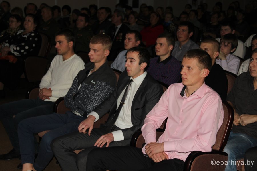 Протоиерей Сергий Пешко выступил с напутственным словом перед призывниками в центральном районном Доме культуры, по случаю их отправки в армию. В своем напутственном слове священник отметил, что оборона страны готовит молодого человека к исполнению гражданского и христианского долга, рассказал о важности и почетности службы, пожелав будущим воинам, прежде всего, духа премудрости, разума и достойного исполнения священной миссии. Затем помолившись, священнослужитель благословил призывников, окропив их святой водой. На торжественное мероприятие были приглашены начальник направления призыва военного комиссариата Гомельской области, полковник Олег Костюченко, почетный гражданин Буда-Кошелевского района, генерал-лейтенант в отставке Михаил Козлов, заместитель председателя райисполкома Геннадий Вамбриков, военный комиссар Буда-Кошелевского и Чечерского района Владимир Петрусев, а также родители будущих солдат. Для них и для призывников после торжественного вручения повесток прозвучала концертная программа, подготовленная артистами и творческими коллективами Будакошелевщины. А завершил День призывника совместный фотоснимок. |