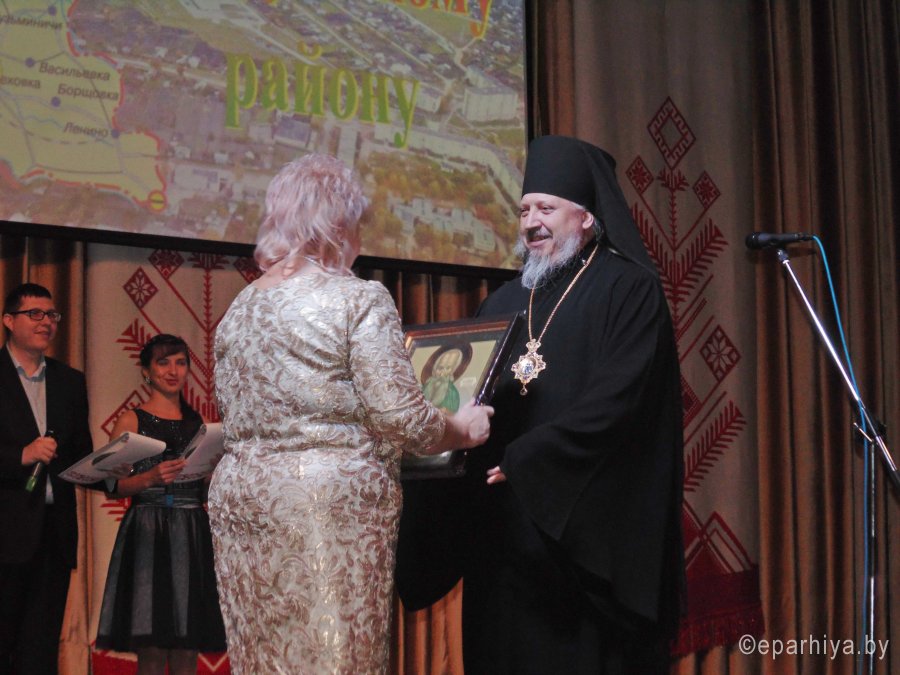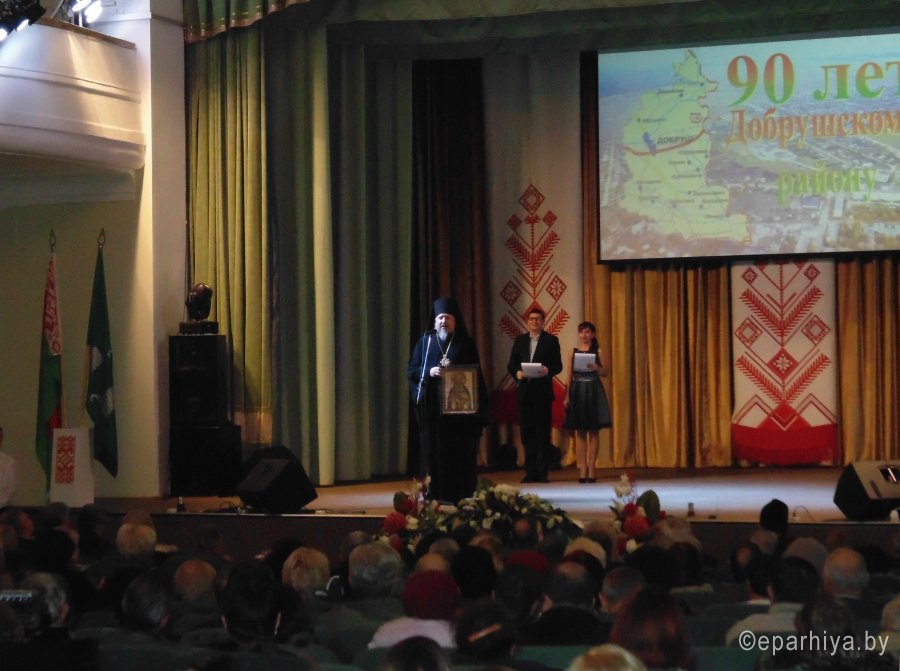 9 декабря 2016 года Преосвященный Стефан, епископ Гомельский и Жлобинский посетил г.Добруш. В ходе своего визита Владыка, в качестве почетного гостя, в сопровождении благочинного округа протоиерея Алексея Пилипенко, принял участие в праздничном мероприятии, посвященном 90-летию образования Добрушского района. Обращаясь к присутствующим Владыка отметил: «Мне сегодня очень приятно стоять здесь - на этой сцене и поздравлять всех вас - жителей нашего Добрушского района, прославленного не только ратными и трудовыми подвигами народа, но и духовной жизнью. Здесь были обретены мощи святого праведного Иоанна Кормянского, о котором теперь знают на всех континентах нашей планеты. Который, будучи простым сельским священником, обрел от Бога такой дар прозрения и исцеления, что мы и сегодня испытываем и получаем благодатную помощь, приходя к его святым мощам в Свято-Иоанно-Кормянский женский монастырь". Владыка поблагодарил всех присутствующих в зале гостей, пожелал мира, добра и благополучия на многие годы и передал в дар Мохоревой Ольге Фёдоровне, для Добрушского районного исполнительного комитета, икону святого праведного Иоанна Кормянского, святого, под благодатным покровительством которого находится Добрушский район. |