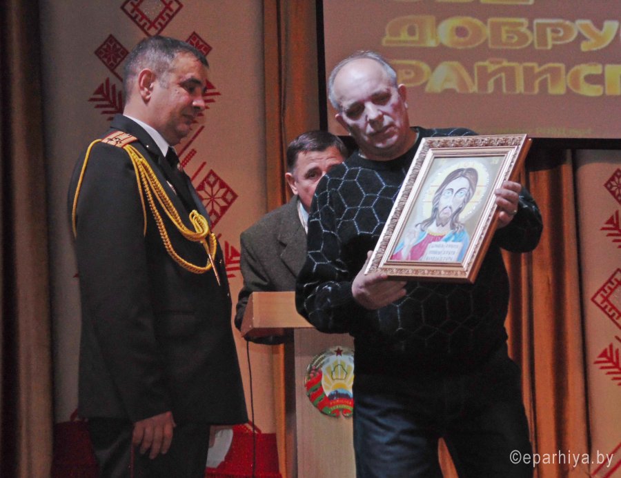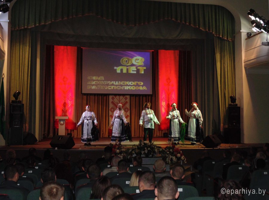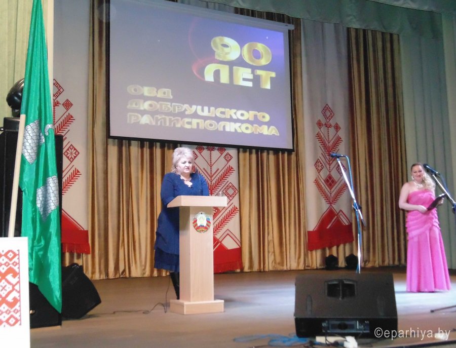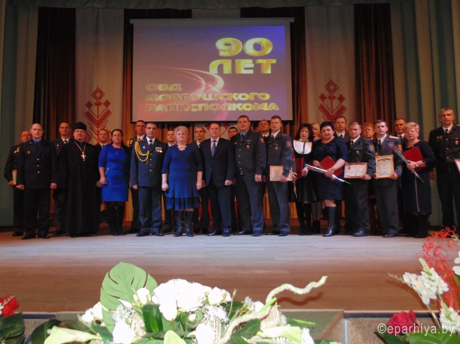 10 декабря 2016 года в Добрушском районном Дворце культуры состоялось торжественное мероприятие, посвященное 90-летию Отдела внутренних дел райисполкома. С юбилейной сцены звучали теплые слова поздравления, преподносились подарки, лучшим представителям ОВД вручали памятные награды, с концертными номерами перед собравшимися выступал ансамбль «Пламя» УВД Гомельского облисполкома. С поздравительным пастырским словом обратился к присутствующим благочинный Добрушского округа протоиерей Алексий Пилипенко. В своем выступлении священник говорил о таких категориях, как добро и зло, их противопоставлении, рассказал одну из шутливых версий происхождения названия города Добруша. А также выразил свою безмерную радость сотрудничеству с правоохранительными органами района. В подарок вручил святой образ Георгия Победоносца и православные календари. «Очень благодатно и радостно на душе, когда ваши сотрудники обращаются в Православную Церковь за молитвенной помощью, — говорил отец Алексей, — а такое бывает нередко. Поэтому на помощь в борьбе со злом хочу вам вручить икону Георгия Победоносца. Здесь он копием побеждает древнего змия. Так вот, в его образе он побеждает всё зло. И дай Бог, чтобы зло, в борьбе с которым вы участвуете, поддавалось вашей доброте. И, невзирая на букву закона, вы были бы улыбающимися как сегодня, радостными, общительными и несли добро в этот мир». В заключение на память о событии был сделан общий снимок почетных гостей на сцене Дворца культуры. |