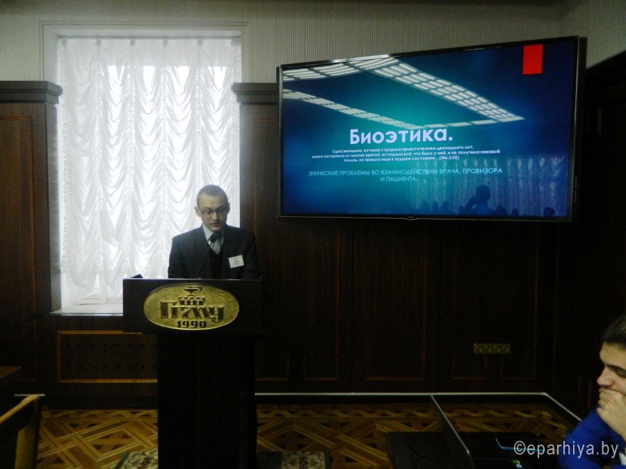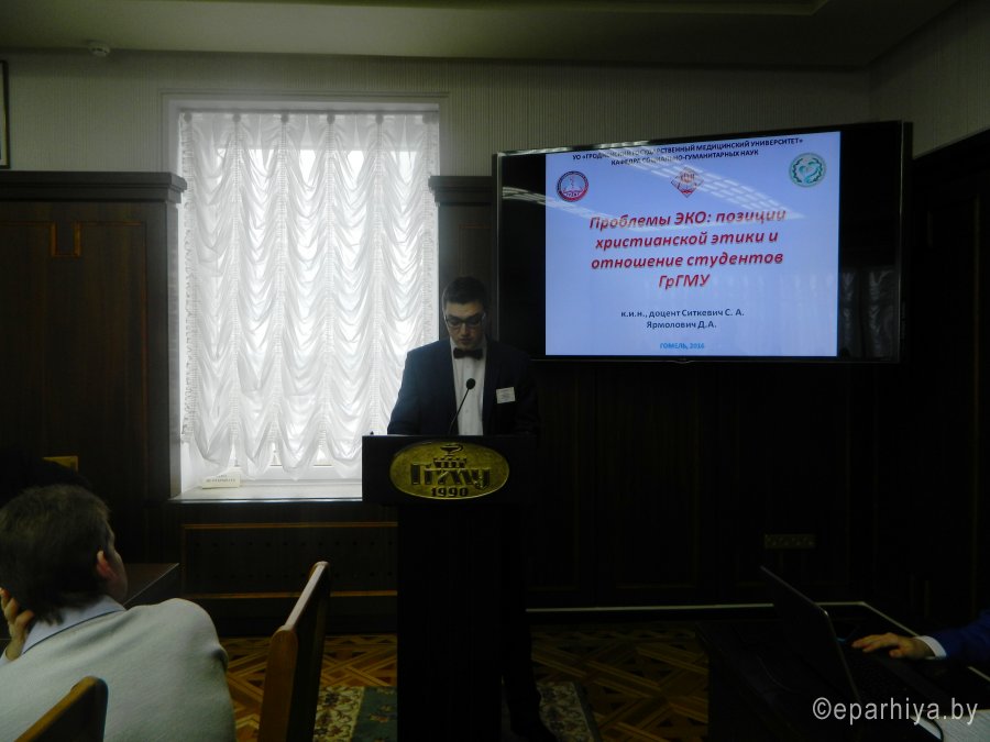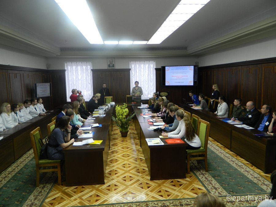15 декабря 2016 г. в рамках сотрудничества между Гомельским Государственным Медицинским Университетом (ГомГМУ) и Гомельской епархиией в ГомГМУ состоялись очередные научно-образовательные чтения «Христианство и современная медицина». В Чтениях, по благословению Преосвященного Стефана, приняли участие представители духовенства Гомельской епархии (архим. Савва (Мажуко), прот. Вадим Лапицкий, иерей Павел Седько, иерей Павел Перещук, диакон Леонид Поляков). Со стороны ГомГМУ в открытии и работе Чтений участвовали проректор по учебной работе, кандидат биологических наук, доцент С.А. Анашкина; заведующая кафедрой общественного здоровья и здравоохранения, доктор медицинских наук, профессор Т.М. Шаршакова; ассистент кафедры онкологии В.В. Похожай; ассистент кафедры внутренних болезней Кононова Оксана Николаевна и др. Среди докладчиков и слушателей были студенты ГомГМУ и других медицинских учебных заведений РБ. В докладах, зачитанных и обсужденных на Чтениях были представлены такие актуальные проблемы современного общества и медицины, как профилактика суицида, аборты и контрацепция, паллиативная медицинская помощь; затрагивались этические вопросы, относительно трансплантологии, эко, аспектов взаимодействия врача, провизора и пациента; поднималась тема значения традиционных семейных ценностей. Кроме того, в ходе Чтений были обсуждены формы и перспективы сотрудничества медицинских работников с Белорусской Православной Церковью. |