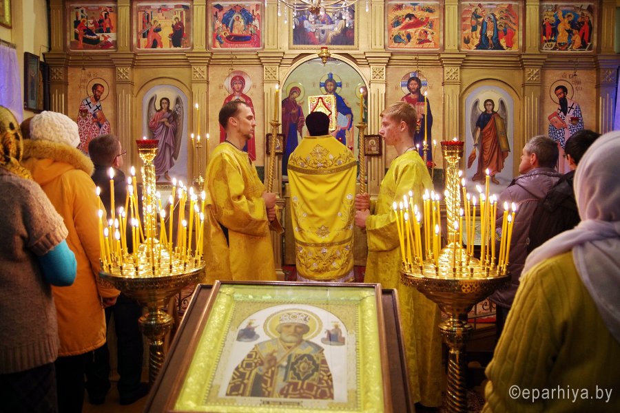 19 декабря в день памяти святителя Николая Чудотворца храм святителя Василия Великого в г. Жлобине принимал гостей. Молодые люди из отделения дневного пребывания инвалидов при «Территориальном центре социального обслуживания населения Жлобинского района» вместе со своими воспитателями и родителями молились за Божественной Литургией и приобщались Святых Христовых Тайн. Общение с инвалидами, педагогами и родителями из отделения продолжается второй год. Сестры из сестричества в честь иконы Божией Матери "Всецарица" при храме святителя Василия Великого регулярно посещают отделение, знакомят ребят с православной верой, праздниками, богослужением, вместе отмечают праздники. К великой радости, уже традицией становится участие ребят и их родителей в Таинстве Причащения в храме. По окончании Божественной Литургии настоятель храма иерей Вячеслав Рябица поздравил гостей и постоянных прихожан с днем памяти великого святого, покровителя и защитника всех, кто с верой просит его помощи и молитв - святителя Николая архиепископа Мир Ликийских. Батюшка особо поздравил ребят из отделения с Причастием, пригласил их вместе праздновать Рождество Христово. |