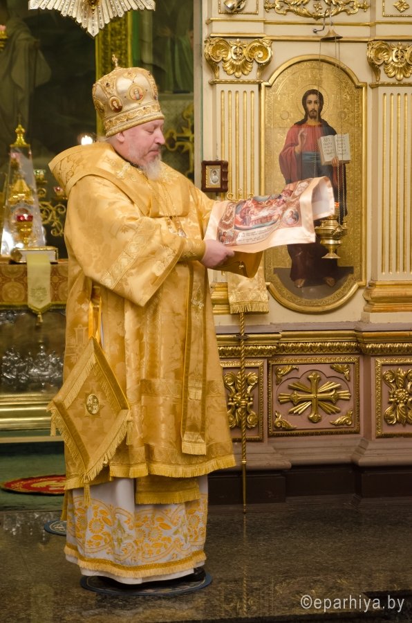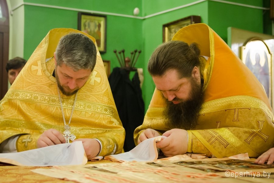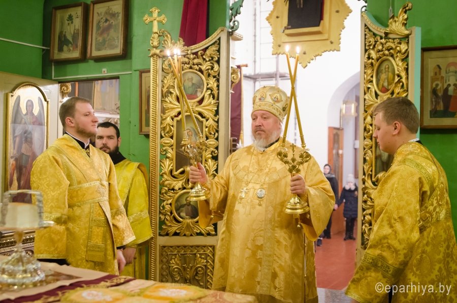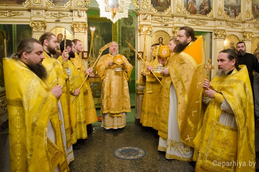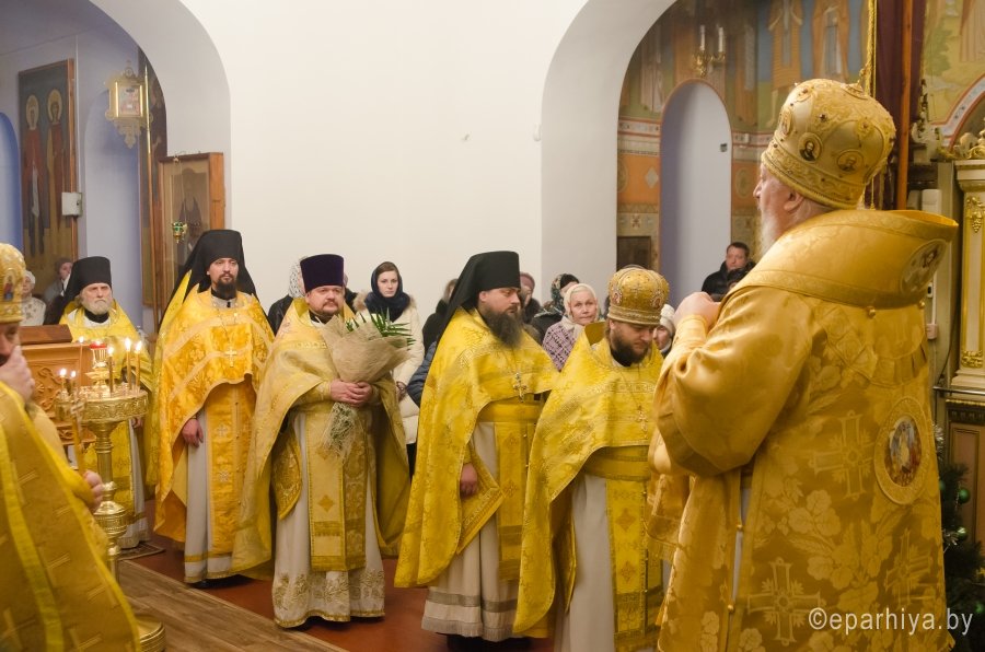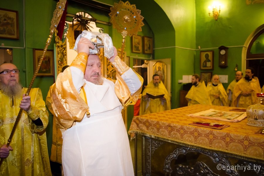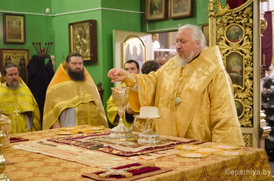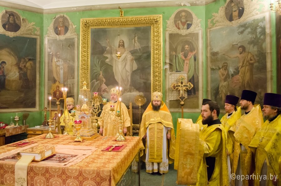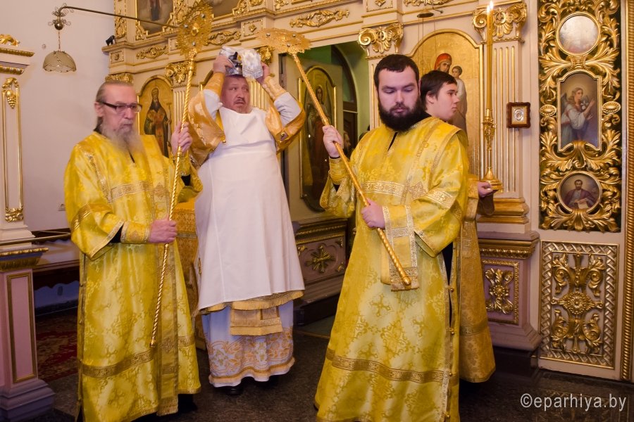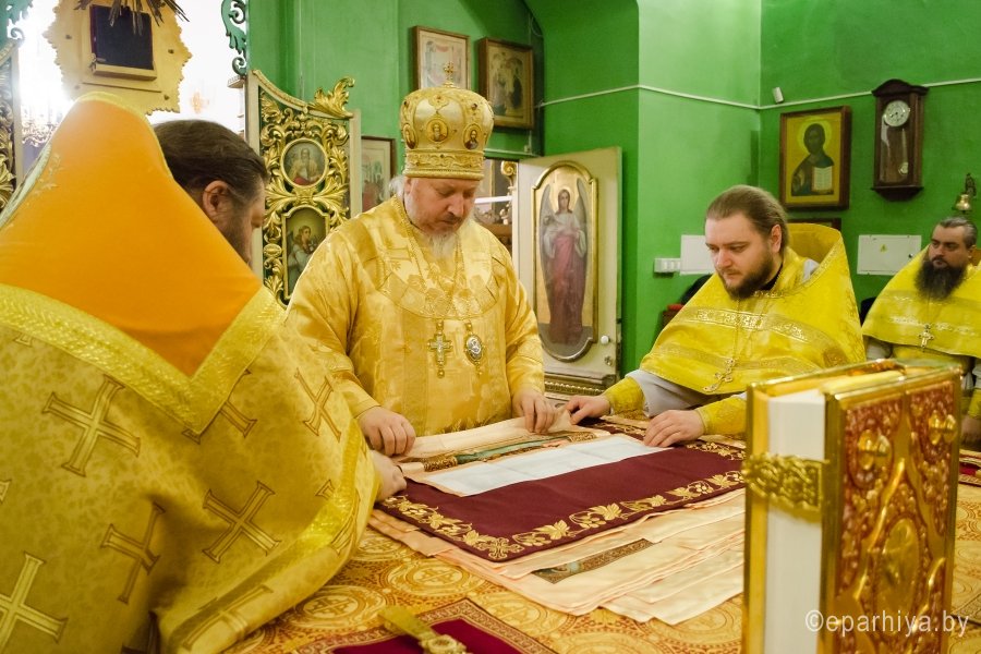 4 января 2017г., в день своего монашеского пострига, Преосвященный Стефан, епископ Гомельский и Жлобинский совершил Божественную литургию в Свято-Никольском мужском монастыре г. Гомеля. Преосвященному сослужили: наместник монастыря архимандрит Амвросий (Шевцов), братия монастыря в священном сане и духовенство Гомельской епархии. За Божественной литургией Владыка совершил чин освящения Антиминсов. За богослужением молилась игуменья Свято-Тихвинского женского монастыря игуменья Вера (Афонькиина) с сестрами. По окончании богослужения Председатель Информационного отдела Гомельской епархии протоиерей Олег Кострома поздравил Преосвященного Стефана с прошедшим Днем рождения и Днем пострига и преподнес в дар букет цветов. Антиминс (греч. antimension «вместопрестолие», от греч. anti вместо и лат. mensa стол), четырехугольный плат с изображением положения Иисуса Христа во гроб из льняной или шелковой материи, с вшитыми частицами мощей святых, на котором совершается Таинство Евхаристии. |
