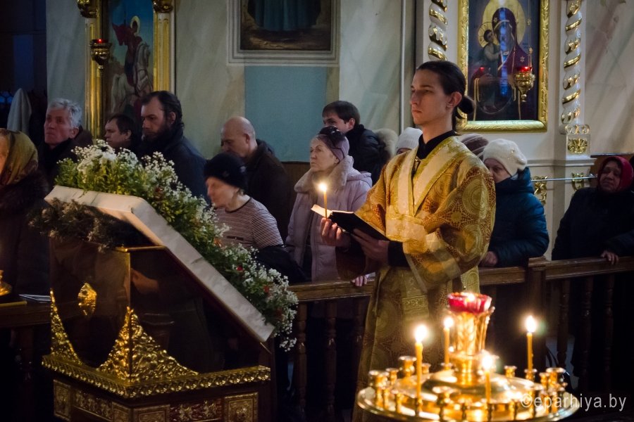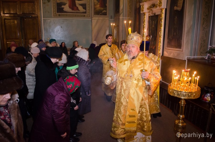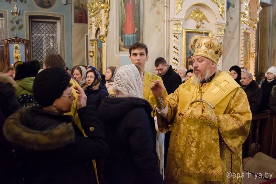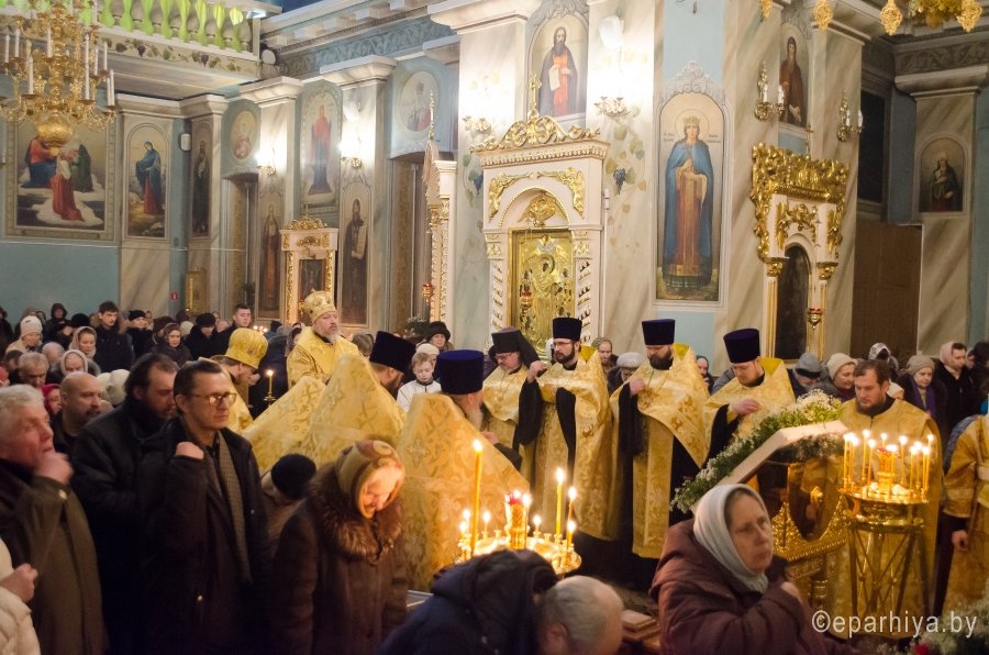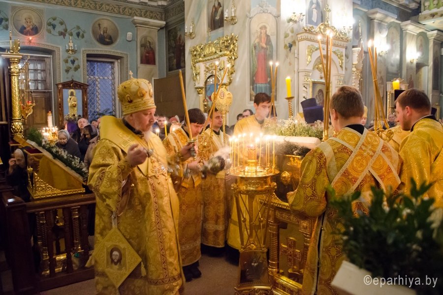 28 января 2017г., в канун Недели 32-й по Пятидесятнице, дня Поклонения честным веригам ап. Петра, Преосвященный Стефан совершил всенощное бдение в Свято-Петро-Павловском кафедральном соборе г. Гомеля. Преосвященному сослужили: секретарь Гомельской епархии протоиерей Георгий Алампиев и духовенство собора. По окончании богослужения Владыка обратился к молящимся со словами Архипастырского назидания. |