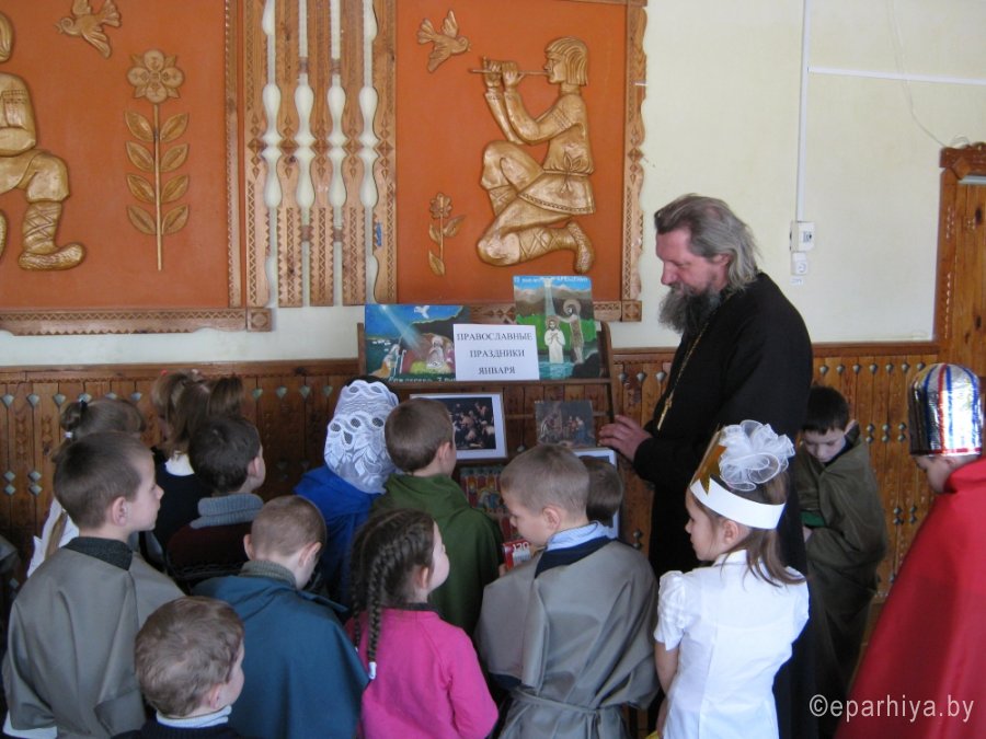25 января 2017г. в ГУО "Кошарский ясли-сад -начальная школа" Рогачёвского района прошло мероприятие "Православные праздники января", в котором принял участие настоятель прихода храма Святого Духа д. Дворец протоиерей Владимир Янчесов и воспитанники сада. Ребята подготовили инсценированное представление о Рождестве Христовом, прочитали стихотворения. Была открыта выставка репродукция картин, посвящённых январским праздникам, на которой были представлены и работы отца Владимира. Священник рассказал школьникам о празднике Крещения Господня, а учитель начальных классов Сычик Татьяна Васильевна познакомила ребят с историей жизни святой великомученицы Татианы и провела викторину. Отец Владимир поздравил Татьяну Васильевну с днём тезоименитства, поблагодарил ребят за интересное представление, пожелал и дальше знакомиться с историей и традициями православных праздников. На прощание батюшка вручил ребятам призы и сладкие подарки. |