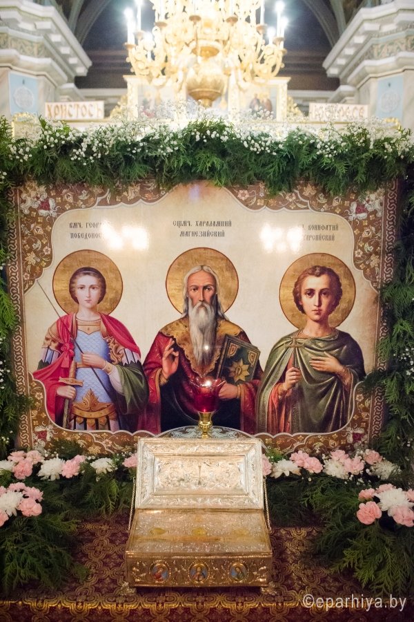 11 марта 2017г.,в Свято-Петро-Павловский кафедральный собор г. Гомеля, по благословению Высокопресовященного Павла, митрополита Минского и Заславского доставлен ковчег с частицами мощей святых вмч. Георгия Победоносца, сщмч. Харалампия и мч. Вонифатия. Православную Святыню, в торжественной обстановке, встретил Епископ Гомельской и Жлобинский Стефан. Поклониться святыне можно будет до 4 апреля 2017г. Проезд: Троллейбусами №№1,2,8,10,15,18,20,20а,23,25, Автобусами №3,12,17,18,18а,27,34,39 До остановки «Площадь Ленина» Акафисты и молебны будут совершаться ежедневно. Святой мч. Вонифатий был милостив к нищим, любвеобилен к странникам и отзывчив ко всем находящимся в несчастии; одним оказывал щедрые милостыни, другим с любовью доставлял успокоение, иным с сочувствием оказывал помощь. Великомученика Георгия за мужество и за духовную победу над мучителями, которые не смогли заставить его отказаться от христианства, а также за чудодейственную помощь людям в опасности — называют еще Победоносцем. Приговоренный к смерти и препровожденный к месту казни, св. Харалампий молился о том, чтобы в том месте, где упокоиваются его мощи, никто не страдал бы от голода или болезней. Помолившись о том, святой предал душу Богу ещё прежде того, как меч палача коснулся его шеи.. |