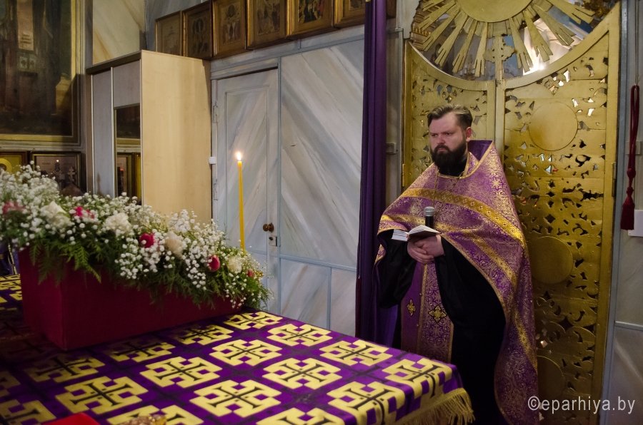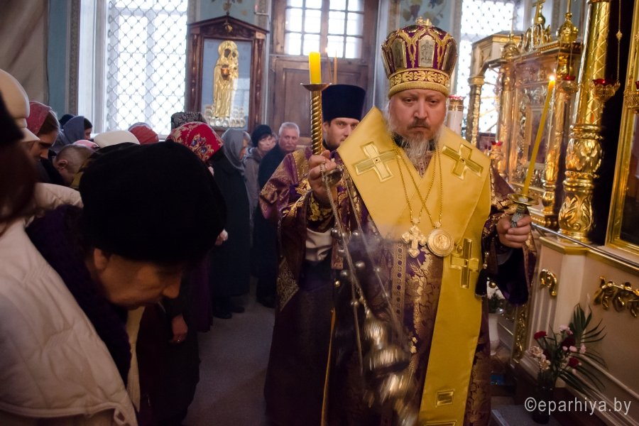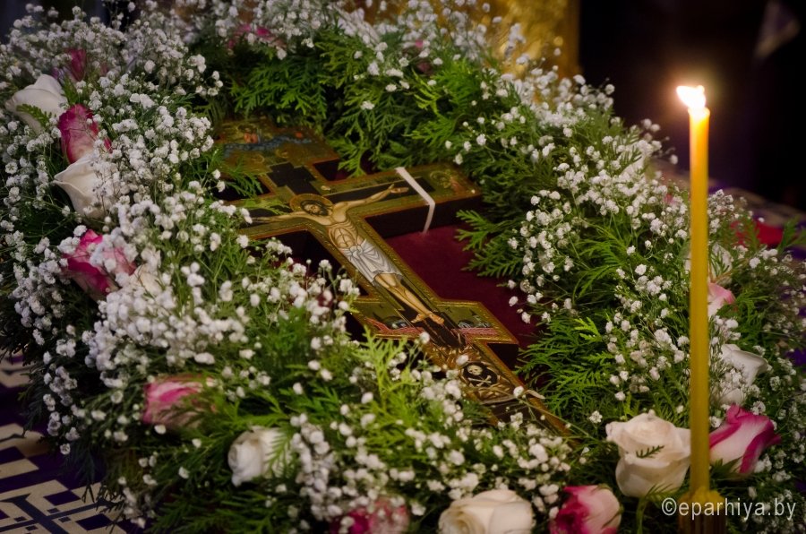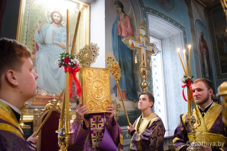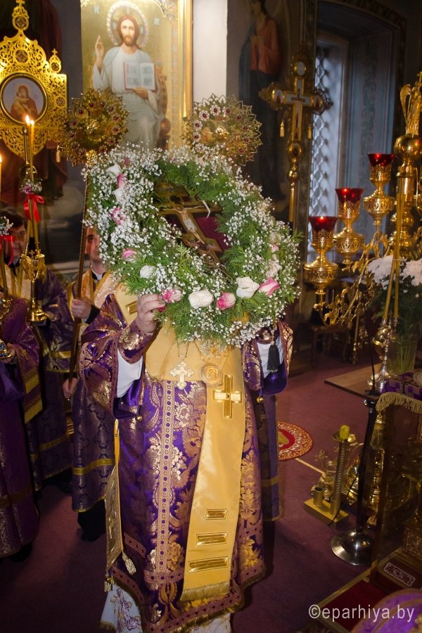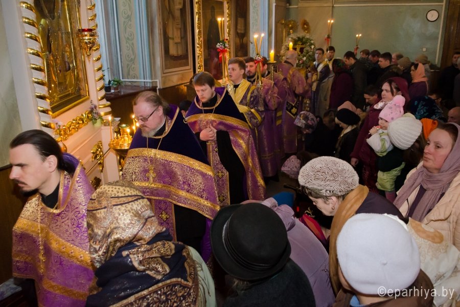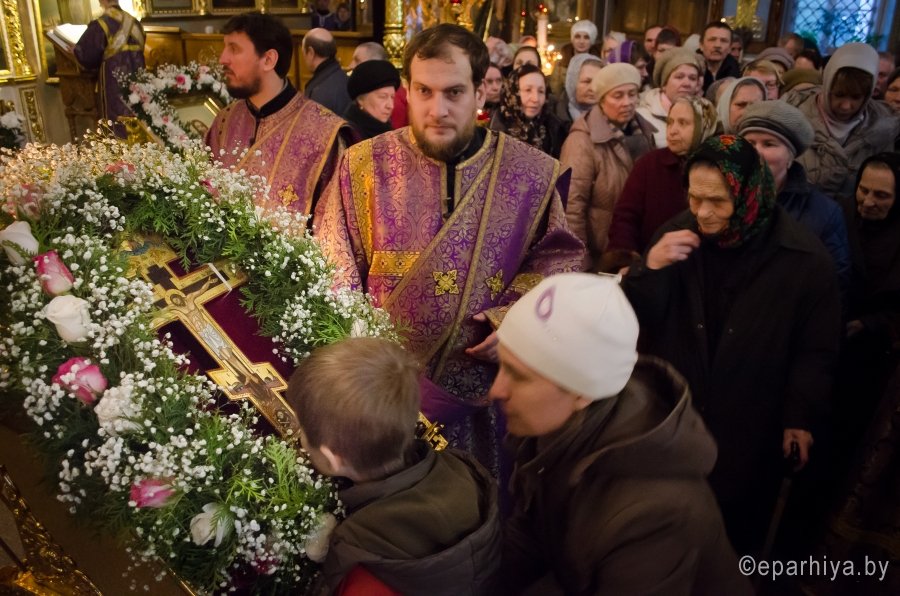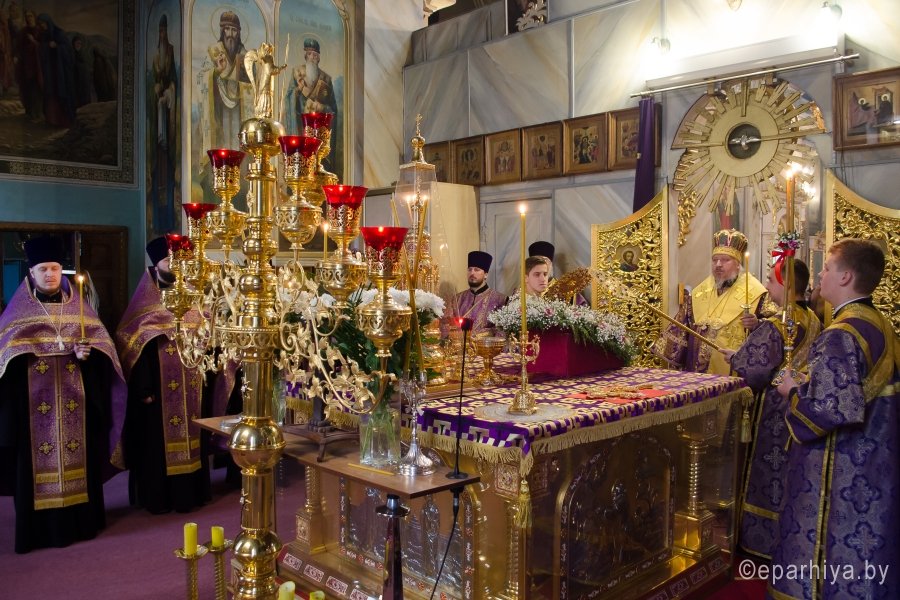 18 марта 2017г., в канун Недели 3-й Великого Поста, Крестопоклонной, Преосвященнейший Стефанвозглавил всенощное бдение с чином выноса Креста в Свято-Петро-Павловском кафедральном соборег.Гомеля. Преосвященнейшему сослужили: секретарь Гомельской епархии протоиерей Георгий Алампиев и духовенство собора. По окончании богослужения Владыка обратился к духовенству и прихожанам собора со словами Архипастырского назидания. «В субботу третьей седмицы Великого поста, во время Всенощного бдения после великого славословия из алтаря на середину храма выносится Крест, которому поклоняются православные христиане. При поклонении Кресту Церковь поет: «Кресту Твоему покланяемся, Владыко, и святое воскресение Твое славим». Эта песнь поется и на Литургии вместо «Трисвятого». Церковь выставляет в середине Четыредесятницы верующим Крест для того, чтобы напоминанием о страданиях и смерти Господней воодушевить и укрепить постящихся к продолжению подвига поста, напомнить всем верующим о том, что путь к Воскресению лежит именно через Крест и спасение души невозможно без борьбы с грехами и страстями, без скорбей и страданий. Обратно в алтарь Крест уносится в пятницу четвертой седмицы Великого поста.» |