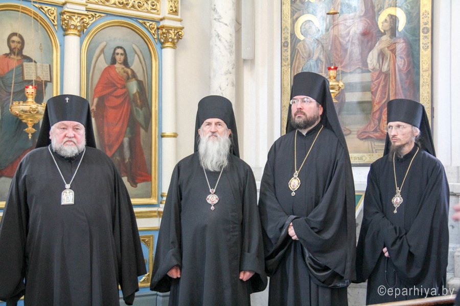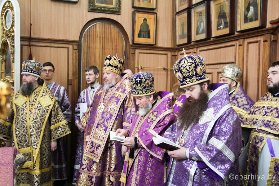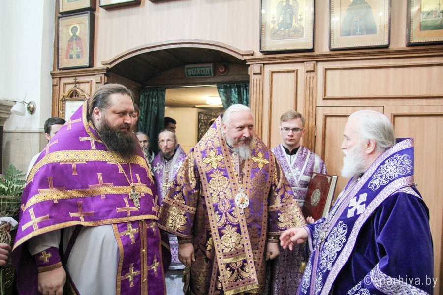 22 марта 2017 года, в среду четвертой седмицы Великого поста, митрополит Минский и Заславский Павел, Патриарший Экзарх всея Беларуси, в сослужении архиепископов: Гродненского и Волковысского Артемия и Новогрудского и Слонимского Гурия; епископов: Могилевского и Мстиславского Софрония; Гомельского и Жлобинского Стефана; Бобруйского и Быховского Серафима; Туровского и Мозырского Леонида; Борисовского и Марьиногорского Вениамина; Слуцкого и Солигорского Антония совершил Божественную литургию Преждеосвященных Даров в Свято-Духовом кафедральном соборе города Минска. Архипастырям сослужили: управляющий делами Минской Экзархии архимандрит Сергий (Брич); наместник Свято-Никольского мужского монастыря города Гомеля, благочинный монастырей Гомельской епархии архимандрит Амвросий (Шевцов); секретарь Минской епархии протоиерей Андрей Волков; первый проректор Минской духовной академии протоиерей Владимир Долгополов; настоятели храмов Минской епархии; клирики Свято-Духова кафедрального собора и другие приглашенные гости в священном сане. Богослужебные песнопения исполнил архиерейский хор под управлением Виталия Соболевского. Проповедь перед Причастием произнес клирик Свято-Духова кафедрального собора протодиакон Николай Авсиевич. По заамвонной молитве архипастыри и сослужащие священнослужители совершили славление и поклонение Животворящему Кресту Господню. По окончании богослужения архиепископ Новогрудский и Слонимский Гурий огласил поздравительный адрес Синода Белорусской Православной Церкви митрополиту Павлу по случаю 25-летия со дня его архиерейской хиротонии и преподнес в дар святую просфору и цветы. В ответном слове Патриарший Экзарх поблагодарил архипастырей, прихожан и духовенство собора за поздравление, добрые благопожелания и обратился ко всем присутствующим в храме со словом назидания. После этого со словами поздравления к владыке Павлу обратились: настоятельница Гродненского Свято-Рождество-Богородичного ставропигиального женского монастыря игуменья Гавриила (Глухова); настоятельница Полоцкого Спасо-Евфросиниевского женского монастыря игуменья Евдокия (Левшук); первый проректор Минской духовной академии протоиерей Владимир Долгополов; первый проректор Института теологии Белорусского государственного университета иерей Олег Голубев. Митрополит Павел поблагодарил игуменью Гавриилу, игуменью Евдокию, протоиерея Владимира Долгополова и иерея Олега Голубева за теплые слова поздравления и за святые молитвы. После этого Патриарший Экзарх поздравил с днем рождения протодиакона Николая Авсиевича, клирика Свято-Духова кафедрального собора, пожелал ему крепости сил духовных и телесных и вручил ему святую просфору и цветы. Митрополит Павел поздравил всех причастников с принятием Святых Христовых Таин, преподал всем архипастырское благословение, вручил всем присутствующим на память о совместной молитве цветы и иконки святых первоверховных апостолов Петра и Павла. |