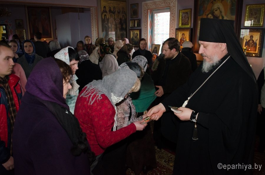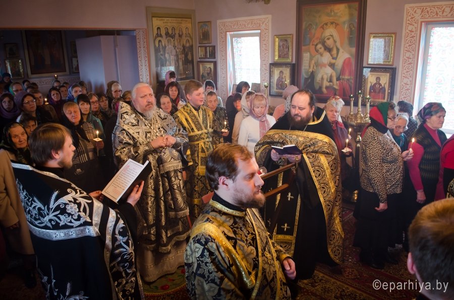 Вечером 27 марта 2017г., Преосвященнейший Стефан, совершил Пассию с чтением акафиста страстям Христовым в храме св. мч. Иоанна Воина в г. Жлобине. Преосвященному сослужили: секретарь Гомельской епархии протоиерей Георгий Алампиев и духовенство епархии. По окончании богослужения Владыка обратился к молящимся со словами Архипастырского назидания. В память об этом дне Преосвященный Стефан раздал всем присутствующим иконки. Пассия (лат. страдание) — особое богослужебное последование, совершаемое в Великий пост, на котором читаются тексты Евангелия, повествующие о страданиях Христа. Эта служба была составлена в середине XVII века святителем Петром (Могилой). |
