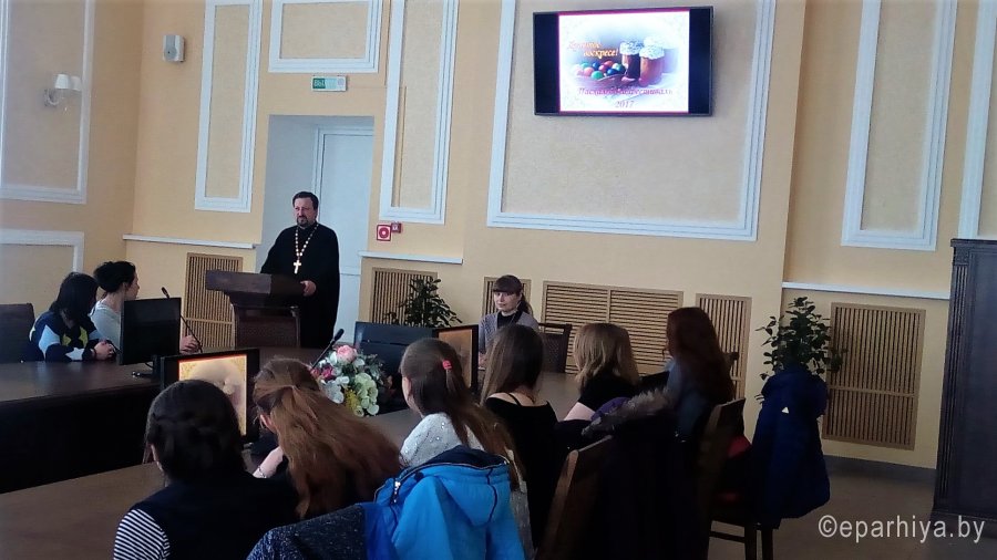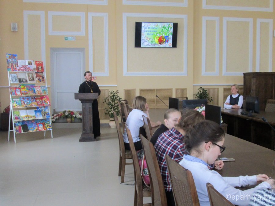 27 апреля 2017г., в ряде библиотек города Рогачева прошли духовно-просветительские встречи священнослужителей Гомельской Епархии с учащимися учреждений образования города Традиционная встреча «Пасхальная радость» прошла в детском отделе Рогачевского Дома книги. В ней принял участие настоятель прихода храма Покрова Пресвятой Богородицы в агрогородке Довск иерей Георгий Орловский . Мероприятие было посвящено самому светлому весеннему празднику - Пасхе. Во время открытого диалога священнослужителя с учащимися школ города звучали песни и стихи на пасхальную тематику, была организованна выставка работ «Светлое Христово Воскресение». На протяжении всей встречи священник знакомил ребят с традициями и символами праздника, а также ответил на их вопросы. Клирик прихода храма святого благоверного князя Александра Невского протоиерей Александр Атрощенко встретился со студентами строительного колледжа в стенах городской библиотеке. Беседу под названием - «Этот светлый праздник Пасха», открыл библиотекарь Пыряева Н.В.: «Праздник светлого Христова Воскресения – главное событие года для православных христиан. Это Праздник праздников и Торжество торжеств. К нему христиане готовятся длительным семинедельным постом. Но многое в значении этого торжества оказывается не совсем понятным для нас». В продолжении встречи протоиерей рассказал молодым людям об истории праздника Светлого Христова Воскресения, а после ответил на все интересующие вопросы. Настоятель прихода храма Святого Духа д. Дворец протоиерей Владимир Янчесов,, в городской библиотеке №1 провёл беседу "Проснись, душа!" с учащимися 5 класса средней школы №4 имени В.С.Величко . До начала беседы ребята смогли познакомиться с детскими православными книгами, представленными на выставке "Православная азбука", которую подготовили сотрудники библиотеки. Священник рассказал ребятам о скорбных событиях, предшествовавших Воскресению Господа нашего Иисуса Христа, и объяснил смысл Пасхи. Затем ребята проверили свои знания по православной культуре в небольшой викторине, после которой настоятель наградил всех участников. |