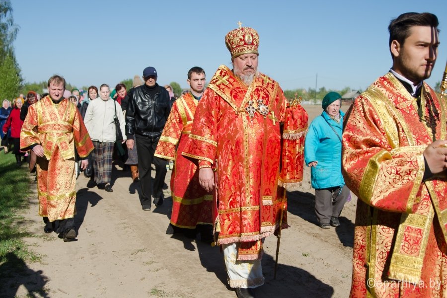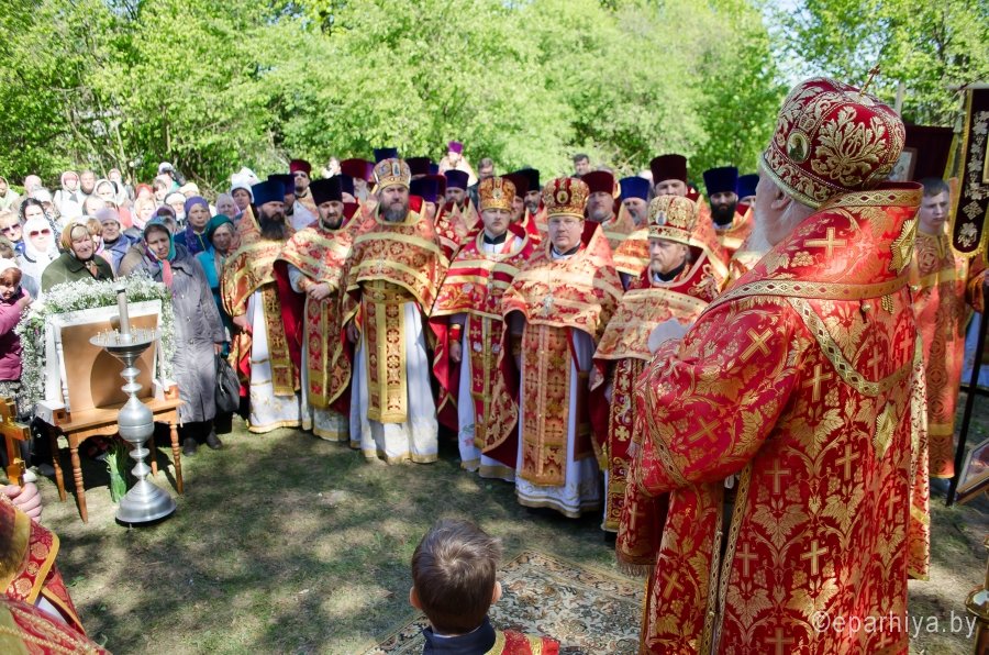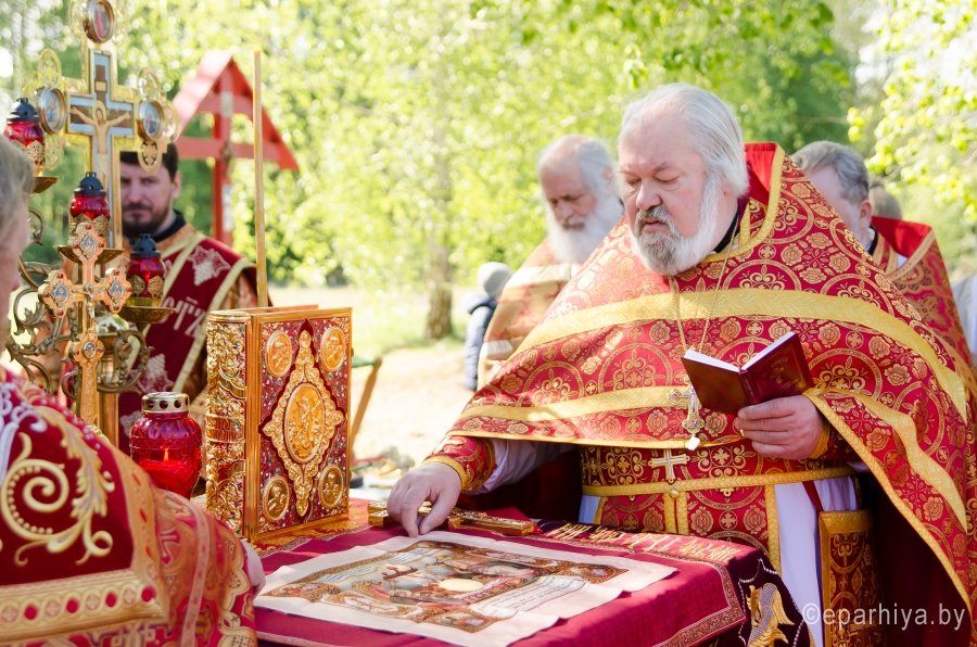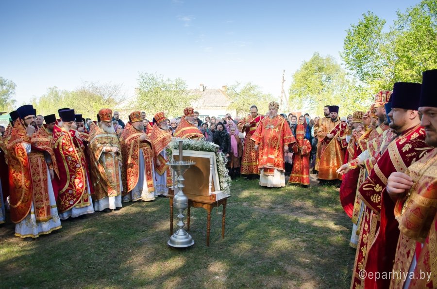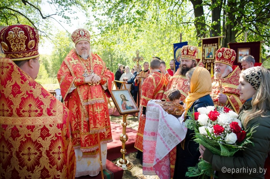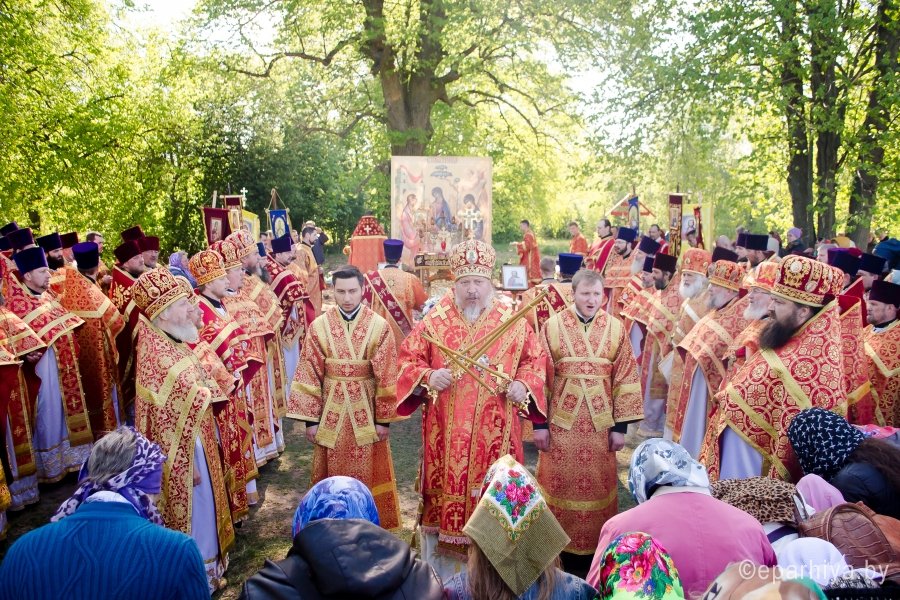 Память – это самое важное, что есть у человека. Она согревает его душу теплом хороших событий и прожигает до мозга костей воспоминаниями о смертях и потерях. Она не дает человеку повторить страшные ошибки, благодаря ей помнят многие подвиги и свершения. В русской православной церкви, отдельное место в памяти каждого верующего отводится тем, кто отдал свою жизнь за молитву Богу и распространение Веры. Тем, кто под страхом смерти не предал своих идеалов и поправу считается Святым и почитаемым для каждого христианина. Однако время идет, оно не щадит не только людей, но и людскую память, стирая из нее имена праведников, которых нельзя забывать. Сегодня, 13 мая 2017г., дабы почтить память святителя Макария Киевского и напомнить всем о его бессмертном подвиге, по благословению преосвященнейшего Стефана, епископа Гомельского и Жлобинского, состоялся Крестный ход и Божественная литургия под открытым небом на территории бывшего Макарьевского монастыря. «По преданию, первоначально около 1760 года здесь обосновался старец-старообрядец Иоасаф, бежавший из г. Гжатска от царских властей. В 1783 году это место известно под названием раскольничья Асафова пустынь, расположено на берегу у слияния рек Дрогитивля и Хоропуть. В 1799 году именуется Иоасафовский монастырь, с 1820-х гг. называется Макарьевским. Постановлением Синода в 1844 году обращён в единоверие, первым настоятелем был игумен Гермоген, скончался в сане архимандрита в 1860 году. Вторым настоятелем стал архим. Гедеон до 1874 года, третьим иеромонах Иоанн (скончался в 1878 г.). Так как было мало единоверческих насельников монахов, и 10 июля (ст. ст.) 1876 года монастырь закрылся, его имущество было передано Чонскому. К 1914 году на месте монастыря находились только заброшенные здания. 12 марта 1914 года решением Синода была создана женская община, приписная к женскому Чонскому монастырю, освящён в честь Макария Киевского. 7 июля из Чонского в Макарьевский была перенесена чудотворная икона Казанской Божией Матери. Указом Синода 2 августа 1916 года преобразован в самостоятельный женский. Первым настоятелем стал игумен Иннокентий (Мельниченко), скончался в Добруше в 1947 году, игуменьей монахиня Серафима (Орлова). На территории было единственное каменное здание, которое в развалинах сохранилось поныне. В нём был домовой храм в честь иконы Казанской Божией Матери. Закрыт в 1928 году, здания и имущество передано совхозу «Хоропуть»». По окончанию Богослужения, к собравшимся обратился Епископ Гомельский и Жлобинский Стефан. В своем обращении Владыка отметил: «Когда-то, здесь был великий монастырь, в котором горела ярким огнем свеча Христианской веры, в котором текла жизнь и была связь с Богом. Но из-за людской невежливости и нетерпимости к Богу, почти сто лет назад, это некогда святое место было отдано под свинарники и сараи. Наша миссия, как истинных верующих, никогда не забывать о прошлом этого места. Сегодняшняя служба – это первая почти что за сто лет Богослужение на данном месте и оно должно стать началом возвращения к истокам, к Святым местам. Сегодня, мы отдаем дань памяти не только этому храму, но и святителю Макарию Киевскому, который под пытками не сдался врагу и понес мученическую смерть. Его имя также забывается, а этот грех будет на нашей вине. Это не единственный пример, наше поколение стало забывать местночтим