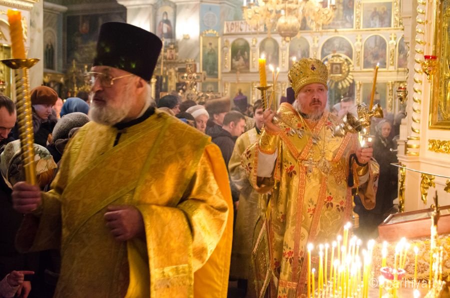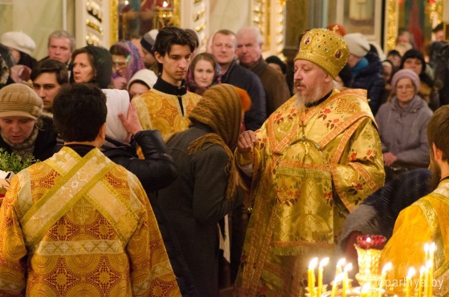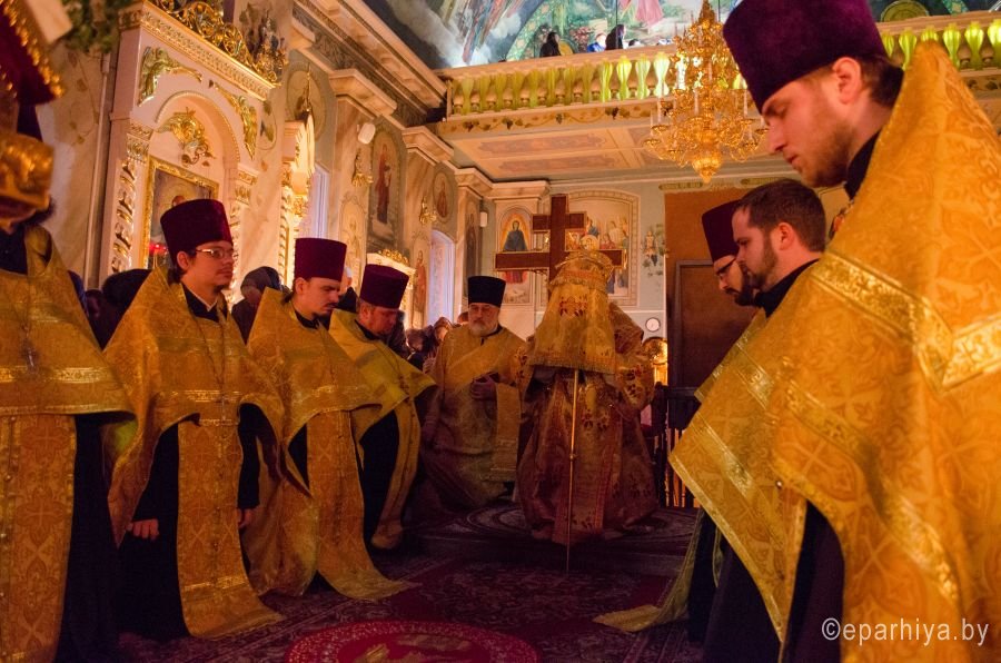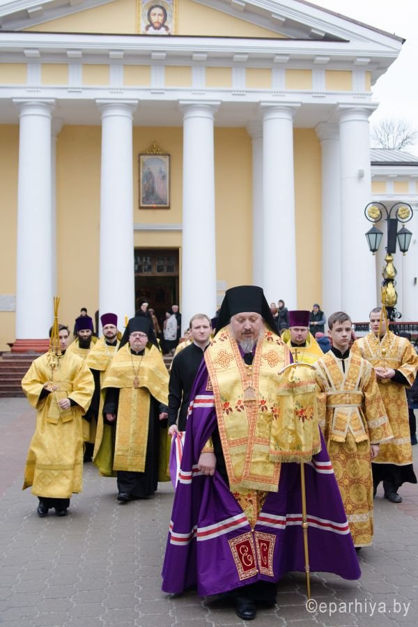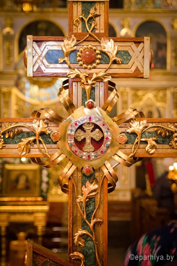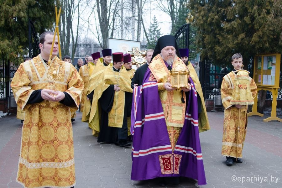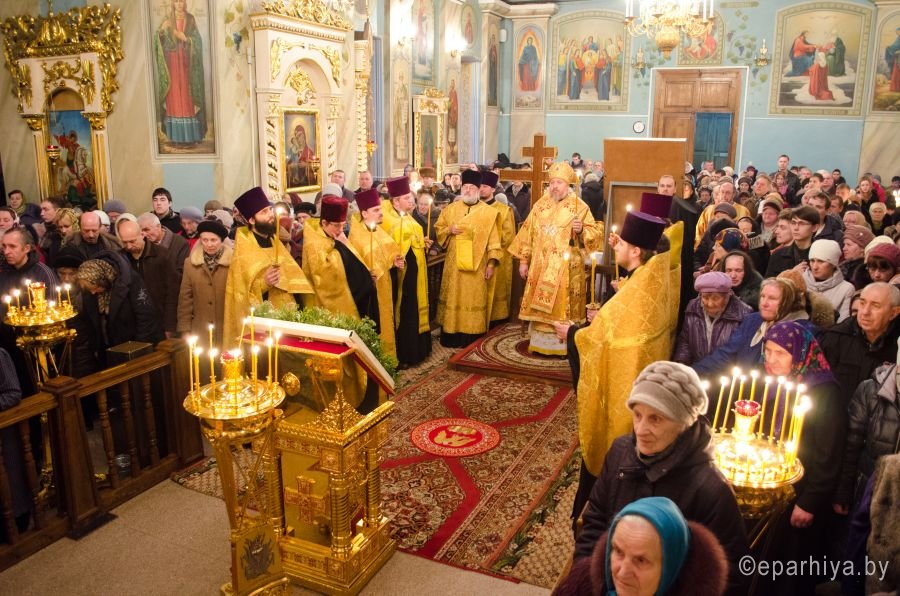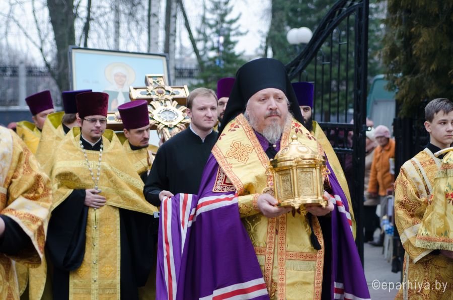 Преосвященнейший Стефан, духовенство Свято-Петро-Павловского кафедрального собора и верующие встретили Крест-мощевик и ковчег с частицей мощей 28 марта 2015г. Древняя святыня — Крест-мощевик с частицей Ризы Господней и частицами честных мощей 21-го святого и ковчег с частицей мощей святой блаженной Матроны Московской будут находиться в кафедральном соборе Петра и Павла г.Гомеля до 15 марта 2015г. 16 марта Святыни отправятся в храм Александра Невского г.Рогачева, где будет находиться до 22 марта 2015г. Затем, с 23 марта Святыни будут доступны для поклонения верующих в храме Иоанна Воина г.Жлобина до 29 марта. Затем, в канун Недели торжества Православия, Преосвященный Стефан в сослужении духовенства собора возглавил всенощное бдение. |