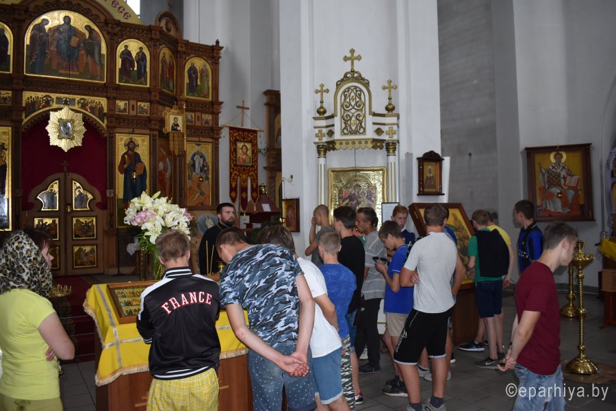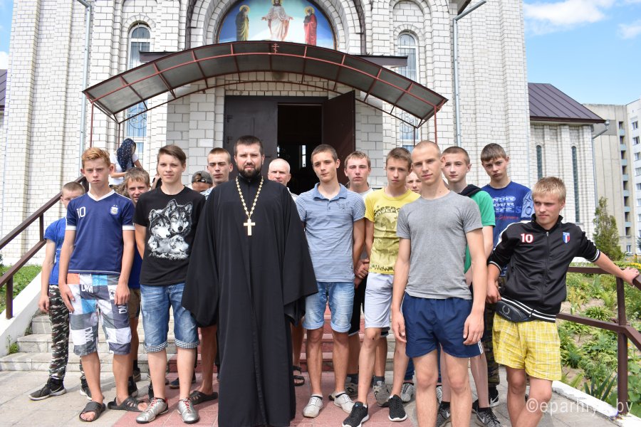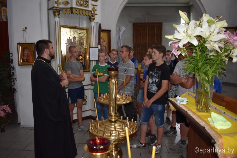 19 июля 2017 г., на экскурсии в храме Преображения Господня г. Светлогорска побывали воспитанники оборонно-спортивного лагеря круглосуточного пребывания, организованного на базе УО «Светлогорский государственный профессиональный лицей химиков». В лагере проходят оздоровление подростки, состоящие на учете в инспекции по делам несовершеннолетних. Внутренняя жизнь лагеря организована строго по режиму: подъем, зарядка, завтрак, трудовой десант по лицею, обязательные занятия по физической подготовке, строевая подготовка на базе в/ч 5525. Вторая половина дня – отдых, развлекательные мероприятия, спортивные игры на свежем воздухе. В план мероприятий включены экскурсия в храм и духовно-нравственные беседы со священнослужителями. Экскурсию для ребят провел клирик храма Преображения Господня иерей Виктор Шевеленко. Подростки узнали, как устроен православный храм. Священник рассказал ребятам об иконах, для чего зажигаются свечи, зачитал отрывок из Евангелия и предложил порассуждать о его смысле. Иерей Виктор постарался ответить на вопросы подростков, призвал посещать храм и пожелал им помощи Божией. |
