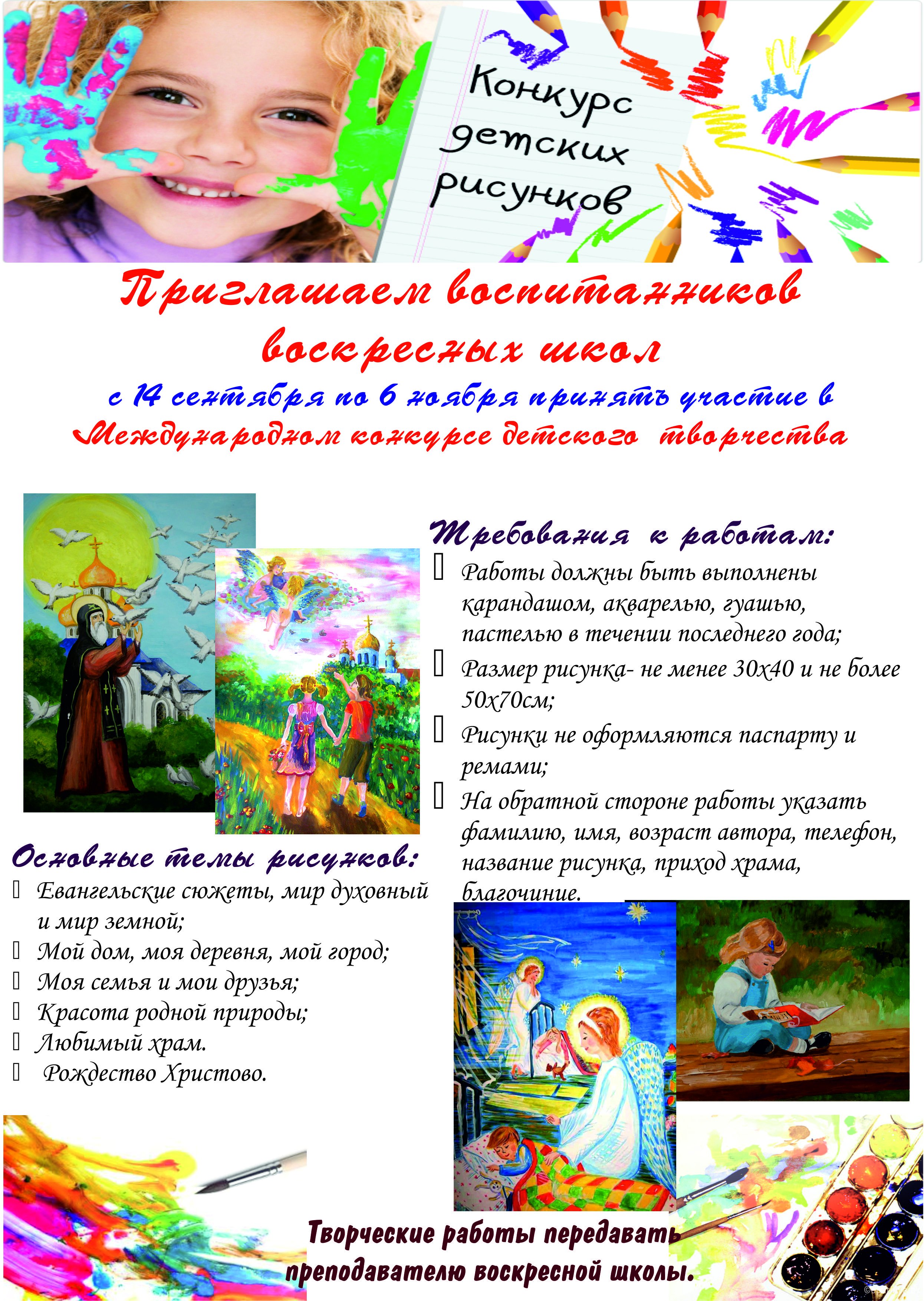 По благословению Святейшего Патриарха Московского и всея Руси КИРИЛЛА в рамках XXVI Международных Рождественских образовательных чтений в январе 2018 года в Москве состоится XIII Международный конкурс детского творчества «Красота Божьего мира». Вся информация о Конкурсе размещена на сайте pravobraz.ru в разделе /Конкурсы/ В рамках Программы сотрудничества между управлением образования Гомельского областного исполнительного комитета и Гомельской, Туровской епархиями Белорусской Православной Церкви на 2015 -2020 годы, с 14 сентября по 1 ноября 2017 года пройдет первый (региональный) этап Международного конкурса детского творчества «Красота Божьего мира». Положение конкурса: По благословению Преосвященного Стефана, епископа Гомельского и Жлобинского и согласно решению Координационного совета (02.09.2014 г.) среди воспитанников воскресных школ Конкурс будет проходить в два этапа: Первый этап. Проходит с 1 октября по 6 ноября 2017 года в каждом благочинии среди воспитанников воскресных школ. Для оценки работ (определение победителей - три призовых места) в благочинии формируется жюри под председательством благочинного, с участием помощника благочинного по религиозному образованию и катехизации, координатора благочиния и других компетентных лиц. Работы–победители (в количестве трёх) доставляются в епархиальный отдел религиозного образования и катехизации не позднее 9 ноября 2017 г. Награждение победителей первого этапа конкурса проводится в благочиниях в торжественной обстановке. Награды определяются ответственными лицами благочиния. Ответственность за проведение первого этапа конкурса в каждом благочинии возлагается на благочинного. Второй этап Проходит в Отделе религиозного образования и катехизации Гомельской епархии с 9 ноября по 13 ноября 2017 года. Для оценки работ в епархиальном отделе РОиК формируется жюри под председательством председателя отдела РОиК Гомельской епархии. Победители второго этапа конкурса среди воскресных школ (по 1 ребёнку с каждого благочиния) награждаются в торжественной обстановке Правящим архиереем в г.Гомеле в рамках тематического мероприятия. Ответственность за проведение второго этапа конкурса возлагается на епархиальный отдел РОиК Гомельской епархии. |