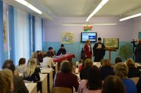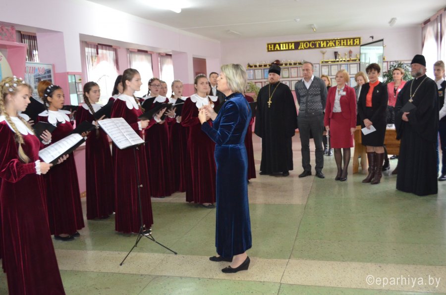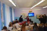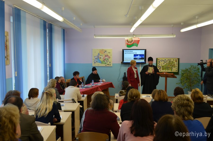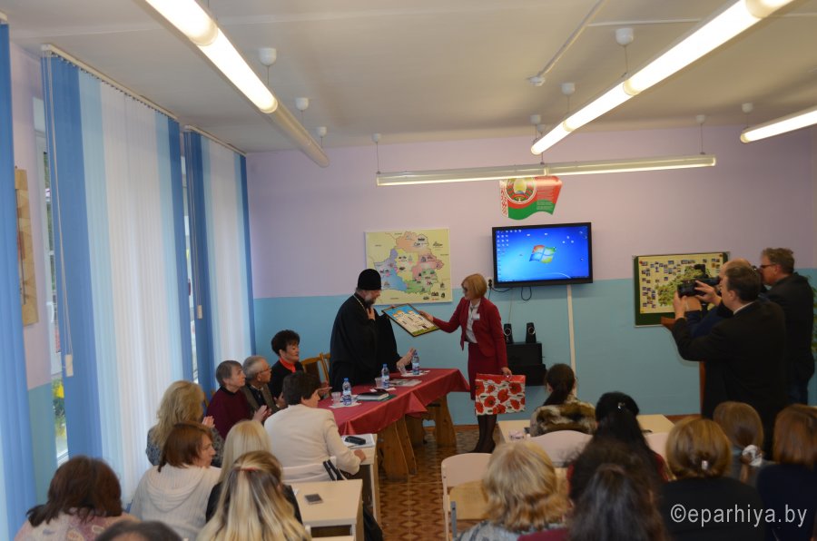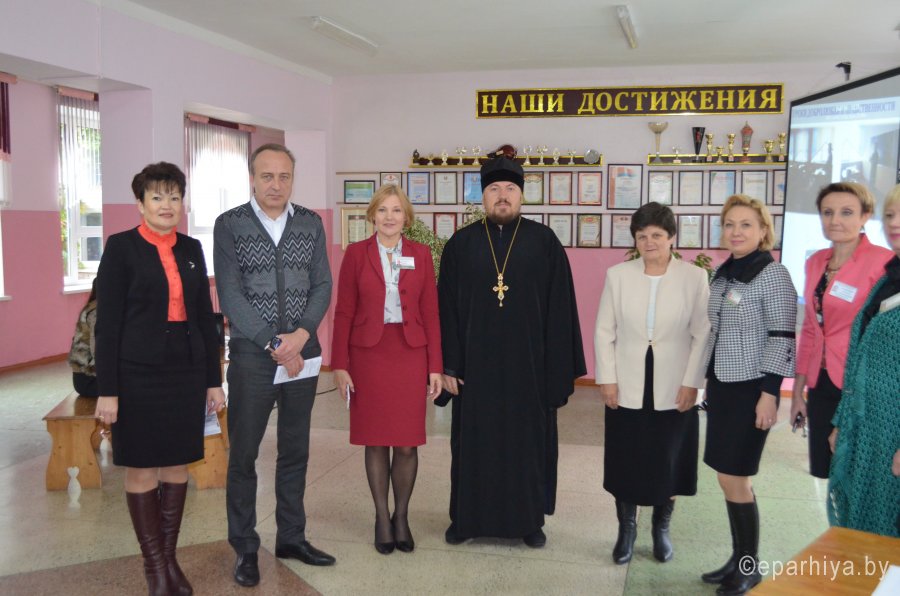 5 октября 2017 г., в государственном учреждении образования «Средняя школа № 9 г. Светлогорска», в рамках реализации инновационного проекта «Духовно-нравственное воспитание школьников на православных традициях белорусского народа», по инициативе почетного гражданина Светлогорска Изяслава Котлярова, состоялась встреча - диалог «Духовно-нравственная сущность связи поколений». Инновационный проект осуществляется в учреждении образования с 2007 года, а с 2011 года учреждению присвоен статус республиканской инновационной площадки. На встречу были приглашены почетные гости: настоятель храма-памятника Всех Святых в г. Минске протоиерей Федор Повный, благочинный Светлогорского округа, настоятель храма Преображения Господня г. Светлогорска протоиерей Александр Кисель, почетный гражданин Светлогорска Изяслав Котляров с супругой – поэтессой Софьей Шах, начальник отдела образования, спорта и туризма Светлогорского райисполкома Ж.В. Черкас, педагоги, учащиеся, представители общественности. В фойе школы, где была организована фотовыставка «Вехи православия», гостей мероприятия приветствовал образцовый концертный хор «Рамонкi» Светлогорской школы искусств. Затем встреча продолжилась в кабинете «Основы православной культуры», созданном в рамках инновационной деятельности. Директор ГУО «Средняя школа № 9 г. Светлогорска» Вераксич Л.А. в своем выступлении представила основные направления деятельности учреждения образования по осуществлению проекта и подчеркнула важность и правильность работы в данном направлении. Затем семинар – диалог продолжил настоятель храма-памятника Всех Святых в г. Минске протоиерей Федор Повный. Совершив небольшой экскурс в историю, протоиерей Федор отметил, что тема, предложенная для встречи, как никогда важна и актуальна сегодня. В завершение своего выступления протоиерей Федор Повный вручил директору школы Л.А. Вераксич Евангелие, поблагодарил организаторов и участников мероприятия за приглашение, доверие и за возможность поделиться своими мыслями и размышлениями, пригласил образцовый концертный хор «Рамонкi» и их руководителя Регину Котвицкую на выступление в храм-памятник Всех Святых. В знак благодарности и уважения учащиеся школы преподнесли протоиерею Федору картину с изображением Храма Преображения Господня г. Светлогорска, созданную своими руками. |