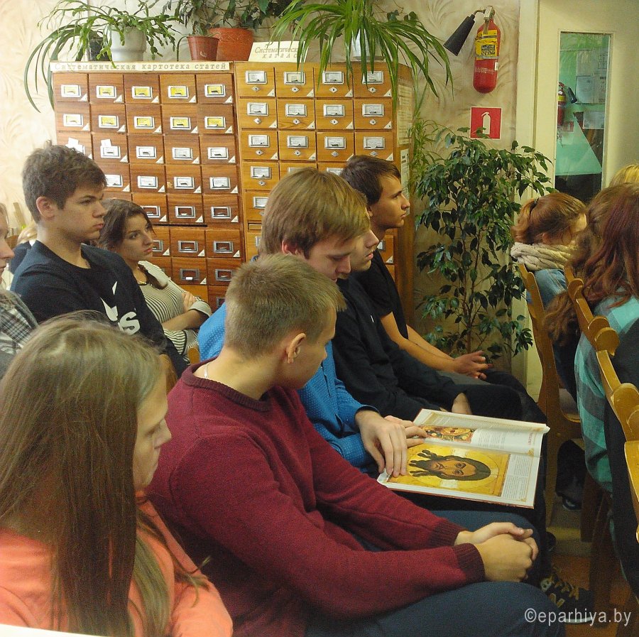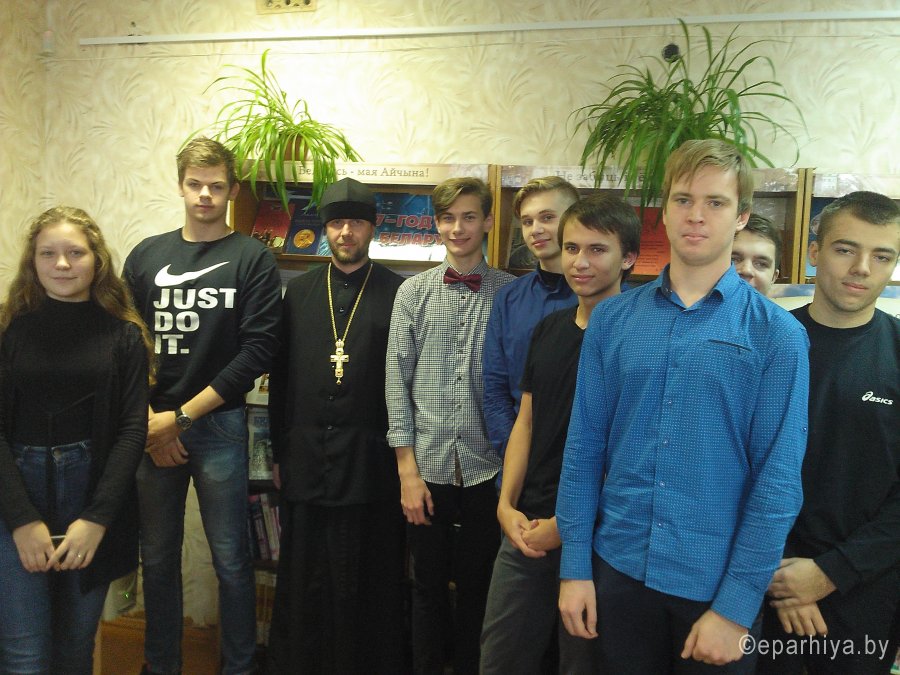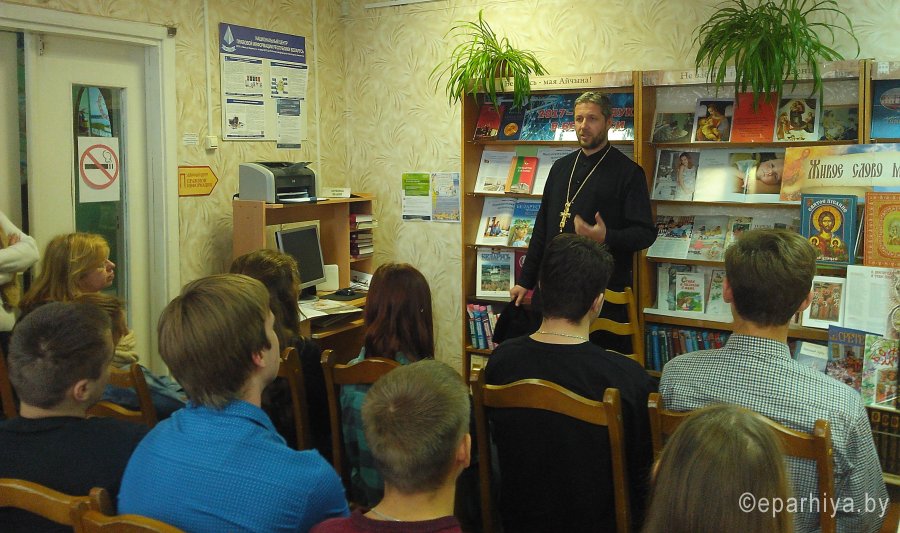 9 октября 2017 г. в библиотеке-филиале №14 прошла православная беседа "Влияние веры на нравственность человека" с участием настоятеля храма Грузинской иконы Божией Матери в г. Гомеле протоиереем Владимиром Масалитиным. Как связаны понятия нравственность и вера? Как влияет поведение и выбор человека на жизнь? Что такое любовь к ближнему? Эти и другие вопросы в живой и доверительной беседе обсуждали священнослужитель и учащиеся 11-го класса ГУО «Средняя школа №15 города Гомеля». Протоиерей Владимир помог ученикам разобраться в понятиях «вера», «религия» «Бог»; являются ли для человека эти понятия важными и необходимыми. Священник рассказал ребятам об истории и значении праздника Покрова Божией Матери, также познакомил детей с иконографией образов Божией Матери. В ходе мероприятия ученикам было предложено ознакомиться с выставкой книг нравственной тематики «Живое слово мудрости духовной», где были представлены современные авторы. Дети с интересом листали и смотрели страницы книг. |