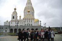 В рамках III областных Покровских образовательных чтений «Нравственные ценности и будущее человечества», которые проходят в Гомельской области с 25 октября по 25 ноября, состоялся двухдневный выездной семинар для преподавателей факультативов и кружков по основам православной культуры и преподавателей воскресных школ Гомельской епархии в Свято-Елисаветинский монастырь в г.Минске. В ходе работы педагоги познакомились с работой частного учреждение образования «Детский сад - средняя школа "Ихвис"» и работой воскресной школы. Зайдя внутрь школы, которая находиться на территории монастыря, сложно поверить, что находишься в школе. Каждого пришедшего встречает светлый уютный холл, который приглашает в сказочный мир с разноцветными витражами. В школе ребята получают знания по всем дисциплинам учебной программы, утвержденной Министерством образования Республики Беларусь, а также с удовольствием посещают интересные и необычные факультативные занятия «Основы православной культуры», на которых ближе знакомятся с православной верой. Также педагоги посетили фестиваль церковных песнопений «Державный глас», который ежегодно проходит под сводами храма в честь иконы Пресвятой Богородицы «Державная», расположенном на территории Минского Свято-Елисаветинского монастыря. Организатор фестиваля — старший регент монахиня Иулиания (Денисова). В праздничной программе приняли участие девичий хор Свято-Елисаветинского монастыря, хор прихода храма в честь иконы Божией Матери «Всецарица» в г.Минске, протоиерей Сергий Киселёв из Киевской области, камерный хор Донецкой Государственной музыкальной академии им.С.С.Прокофьева, камерный хор из Нижнего Новгорода под управлением Ивана Стольникова «Нижний Новгород». Затем вниманию преподавателей была представлена выставка Могилёвской епархии «Венценосная семья. Путь любви», посвящённая святым Царственным страстотерпцам. Кроме экскурсии по монастырю, преподаватели проехали с экскурсией по улицам города и посетили Минский Свято-Духов кафедральный собор и храм-памятник Всех святых и в память о жертвах, спасению Отечества нашего послужившие. |
