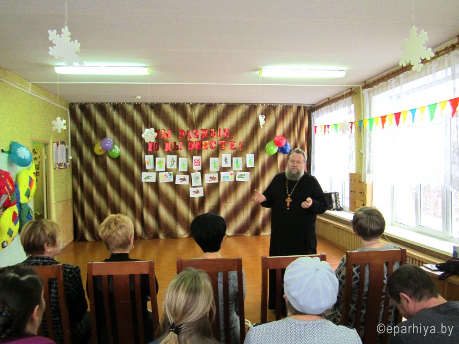 На протяжении четверти века во многих странах мира 3 декабря отмечается День инвалидов. И по этому поводу проводятся различные мероприятия с целью обеспечить полноправное участие в жизни общества людей с ограниченными возможностями. Естественно, основную роль и нагрузку в решении этого вопроса берет на себя государство. Однако, обычные люди, а тем более и верующие, не могут быть равнодушными к проблемам нуждающихся в поддержке и помощи, но в то же время мужественных, крепких духом людей. Милосердие, добродетельность, щедрость, желание помочь ближнему – вот, что должно подстегивать к действиям. Любой человек может помочь людям с ограниченными возможностями, ведь всё, что нужно – это желание. При этом вовсе не всегда для этого потребуются какие-то материальные затраты. Порой можно просто придти и поговорить с человеком, который столкнулся с тяжелой проблемой. И на протяжении нескольких дней, в преддверии Дня инвалидов, храмы Гомельской епархии оказывали помощь людям с ограниченными возможностями и организациям, насельниками которых является эта категория граждан. В течении этого времени прихожанам и духовенству храмов удалось помочь более 3000 инвалидам, проживающих на территории Гомельской области. Гомельское районное благочиние 30 ноября настоятель храма Рождества Пресвятой Богородицы д.Прибытки иерей Петр Прокопцов посетил отделение Паллиативной помощи в д.Зябровка. Все желающие смогли причаститься, а также получить ответы на все вопросы, поделиться своими мыслями и житейскими переживаниями. В этот же день священнослужитель с нравственными беседами посетил ГУО «Климовская СШ», ГУО «Зябровская СШ». 1 декабря настоятель храма Рождества Пресвятой Богородицы в д.Терешковичи иерей Вячеслав Сердюков с беседой «Милосердное отношение к инвалидам» посетил ГУО «Терешковичская СШ». А настоятель храма Введения Пресвятой Богородицы иерей Василий Позняков с беседой посетил Гомельский территориальный центр обслуживания населения. В этот день иерей Петр Прокопцов и настоятель храма Вознесения Господня в д. Грабовка иерей Виталий Партий приняли участие в концерте посвященном Дню инвалидов, который прошел в Дуяновском доме-интернате для престарелых и инвалидов. 8 декабря состоится беседа с воспитанниками отделения дневного пребывания для инвалидов в аг.Урицкое. Рогачевское благочиние Молодёжь прихода храма св.блг.кн. Александра Невского посетила Рогачёвское районное общественное объединение родителей детей-инвалидов и молодых инвалидов. Сёстры милосердия сеcтричества во имя святой преподобной Евфросинии Полоцкой при приходе этого же храма посетили «Рогачёвский психоневрологический дом-интернат для престарелых и инвалидов» д. Виков и передали благотворительную помощь. Также, в г.п.Корма состоялось подведение итогов проекта «Инклюзия через организацию местных сообществ», помощь в осуществлении которого оказывал и приход храма святителя Николая Чудотворца. Были переданы Кормянскому ТЦСОН в подарок материалы для творчества. Жлобинское благочиние 4 декабря настоятель храма святителя Василия Великого иерей Вячеслав Рябица вместе с сестрами милосердия из сестричества в честь иконы Божией Матери "Всецарица" посетили отделение дневного пребывания инвалидов при территориальном центре социального обслуживания нас