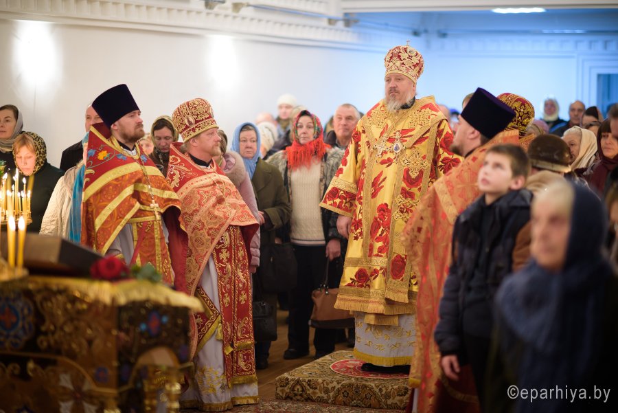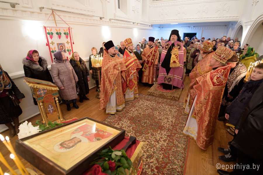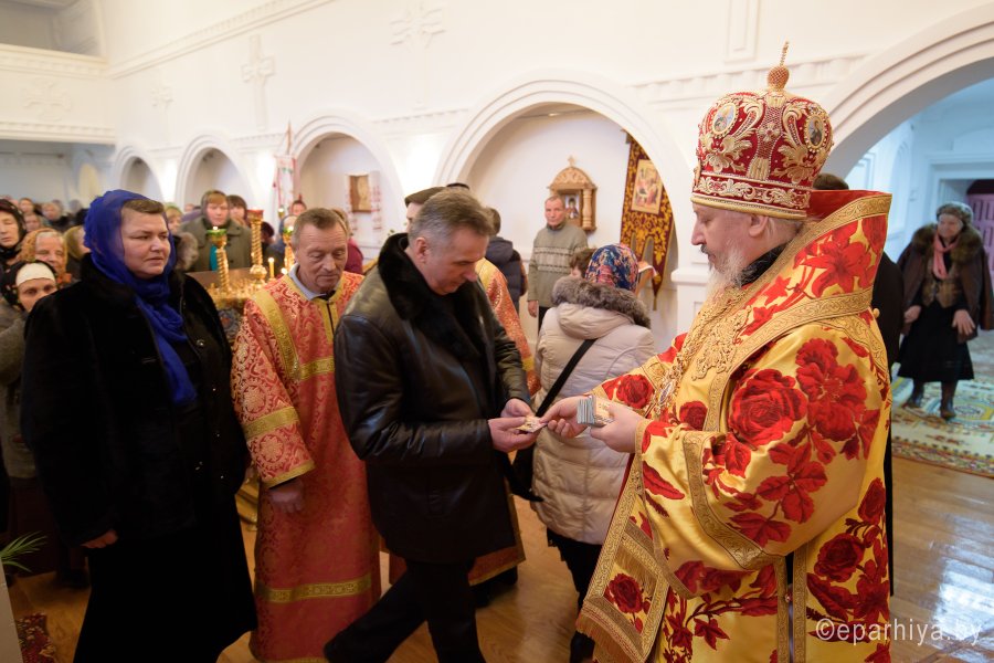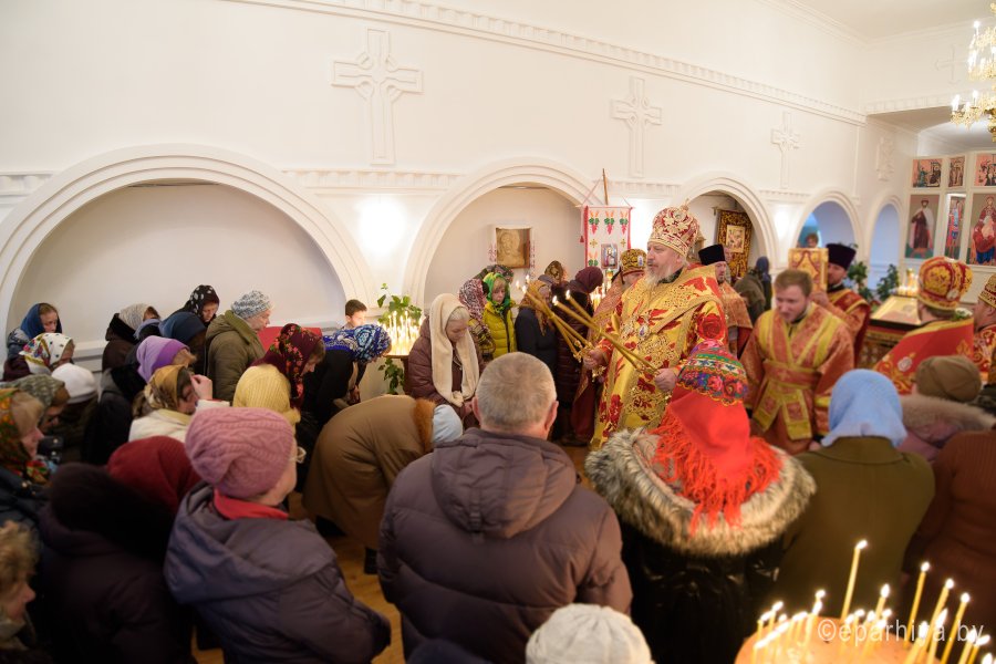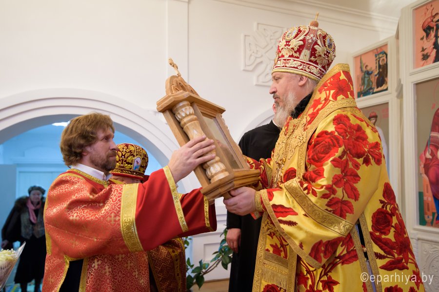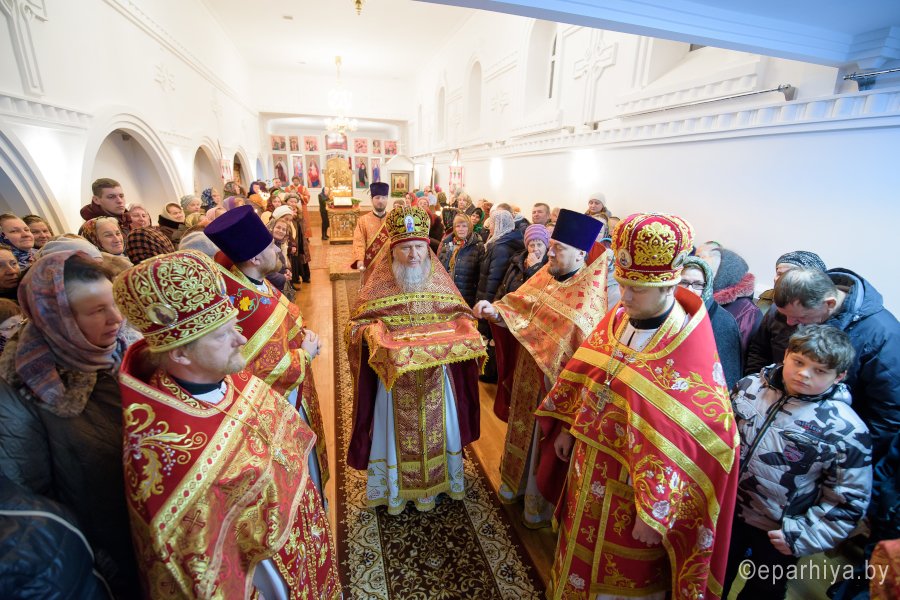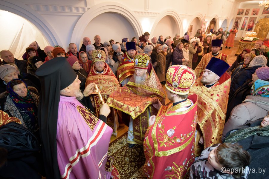 Божественную литургию в день памяти св.вмц.Варвары Преосвященный Стефан совершил в одноименном храме аг.Боровики 17 декабря 2017г. Преосвященному сослужили: секретарь Гомельской епархии протоиерей Георгий Алампиев, благочинный Светлогорского округа протоиерей Александр Кисель, настоятель храма архимандрит Алексий (Желенок) и духовенство Гомельской епархии. По окончании богослужения Владыка совершил чин славления вмц.Варвары. Преосвященному Стефану был передан в дар Святой Образ. После чего епископ Гомельский и Жлобинский Стефан вручил присутствующим памятные иконки, поздравил причастников с принятием Святых Христовых Таин и обратился к молящимся со словами Архипастырского назидания. |