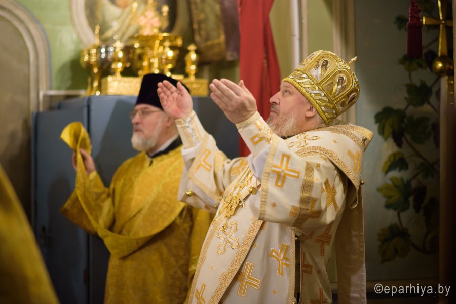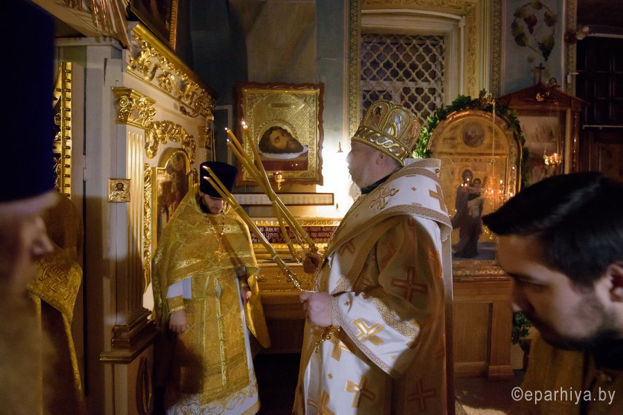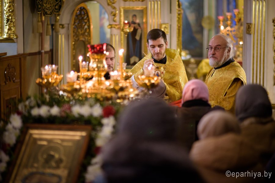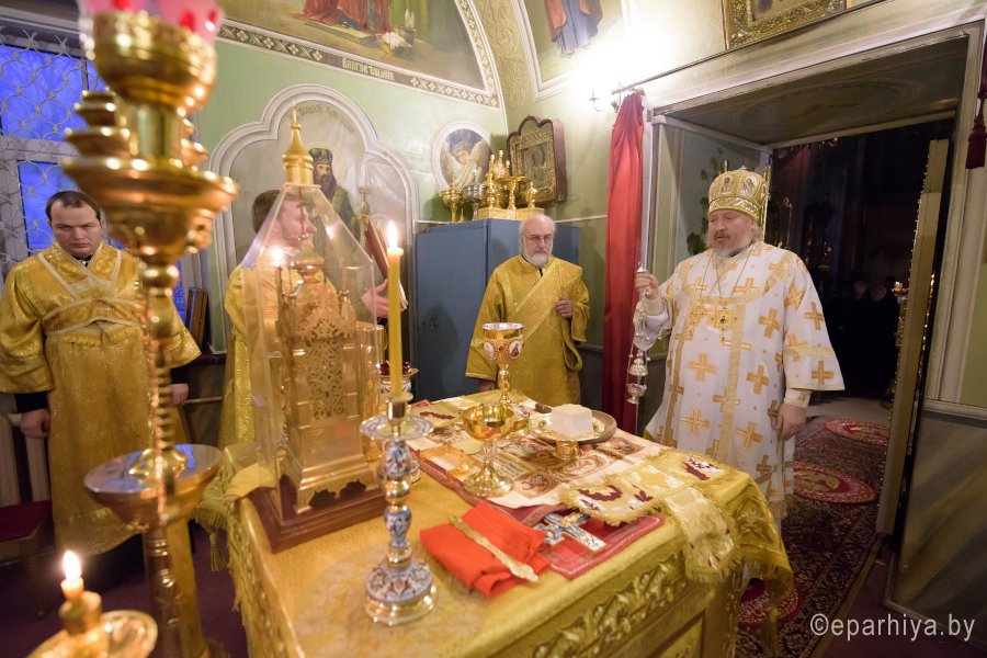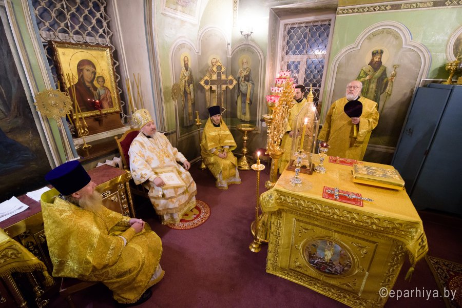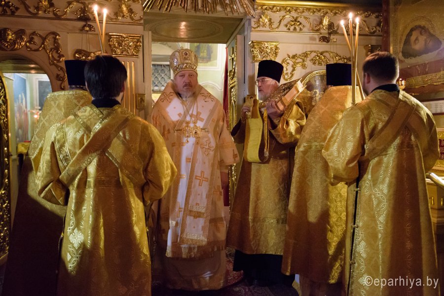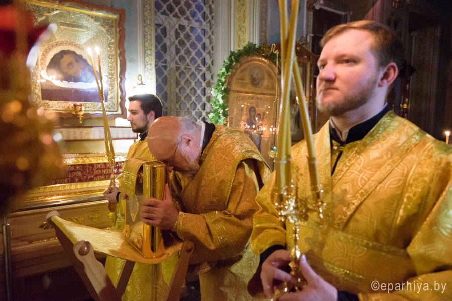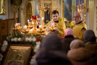 Божественную литургию в четверг 30-й седмицы по Пятидесятнице 28 декабря 2017г. Преосвященный Стефан в сослужении духовенства собора совершил в приделе Казанской иконы Божией Матери Свято-Петро-Павловского кафедрального собора г.Гомеля. По окончании богослужения Владыка поздравил причастников с принятием Святых Христовых Таин и обратился к молящимся со словами Архипастырского назидания. |