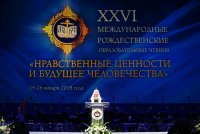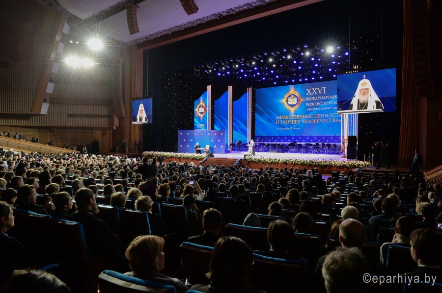 24 января 2018 года делегация Гомельской епархии приняла участие в торжественном открытии XXVI Международных Рождественских образовательных чтений «Нравственные ценности и будущее человечества», которое состоялось в Государственном Кремлевском дворце в Москве. Церемонии открытия предшествовала Божественная литургия в кафедральном соборном Храме Христа Спасителя, за которой молились участники чтений. Открытие форума возглавил председатель Международных Рождественских чтений Святейший Патриарх Московский и всея Руси Кирилл. В числе почетных гостей на церемонии в Государственном Кремлевском дворце присутствовали: первый заместитель председателя Совета Федерации ФС РФ Н.В. Федоров, первый заместитель председателя Государственной Думы ФС РФ А.Д. Жуков, первый заместитель руководителя Администрации Президента РФ С.В. Кириенко, министр иностранных дел РФ С.В. Лавров, министр образования и науки РФ О.Ю. Васильева, министр культуры РФ В.Р. Мединский, министр РФ по делам гражданской обороны, чрезвычайным ситуациям и ликвидации последствий стихийных бедствий В.А. Пучков, министр внутренних дел РФ В.А. Колокольцев, первый заместитель министра образования и науки РФ В.В. Переверзева, полномочный представитель Президента РФ в Северо-Западном федеральном округе, председатель Совета при Президенте РФ по делам казачества А.Д. Беглов, президент Российской академии образования Л.А. Вербицкая, заместитель мэра Москвы в Правительстве Москвы по вопросам региональной безопасности и информационной политики А.С. Горбенко и др. В зале находились более 6 тысяч человек: члены Священного Синода и Высшего Церковного Совета, главы митрополий, епархиальные архиереи и духовенство Русской Православной Церкви, представители Поместных Православных Церквей, члены Межрелигиозного совета России, члены Оргкомитета Международных Рождественских образовательных чтений, главы и представители дипломатических ведомств, полномочные представители Президента Российской Федерации в федеральных округах, руководители федеральных служб Российской Федерации, руководители департаментов федеральных министерств и ведомств, главы регионов, ректоры и представители около 300 российских и зарубежных вузов, директоры общеобразовательных организаций. На центральном экране Государственного Кремлевского дворца был показан видеоролик «Традиционные нравственные ценности». После краткого вступительного слова председателя Оргкомитета чтений, председателя Синодального отдела религиозного образования и катехизации митрополита Ростовского и Новочеркасского Меркурия с докладом выступил Святейший Патриарх Кирилл. Приветствие Президента Российской Федерации В.В. Путина огласил первый заместитель руководителя Администрации Президента РФ С.В. Кириенко. Приветствие председателя Правительства Российской Федерации Д.А. Медведева зачитал министр культуры Российской Федерации В.Р. Мединский. Приветствие председателя Совета Федерации Федерального Собрания Российской Федерации В.И. Матвиенко огласил первый заместитель председателя Совета Федерации ФС РФ Н.В. Федоров. Первый заместитель председателя Государственной Думы Федерального Собрания Российской Федерации А.Д. Жуков огласил приветствие председателя российского парламента В.В. Володина. К собравшимся