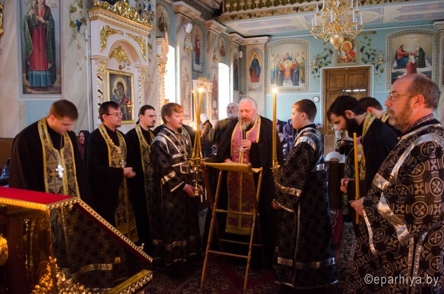 25 марта 2015г. Преосвященнейший Стефан епископ Гомельский и Жлобинский возглавил утреню с чтением Великого покаянного канона преподобного Андрея Критского в Свято-Петро-Павловском кафедральном соборе города Гомеля. Утреня четверга пятой седмицы Великого поста, которая по обычаю служится в среду вечером, носит название Мариино стояние. Это богослужение посвящено подвигу преподобной Марии Египетской – удивительной святой, которая после греховной молодости 47 лет провела в пустыне в подвиге покаяния. Память святой Марии чтится 14 апреля, в воскресенье и четверг 5-й седмицы Великого Поста. На этой утрене полностью прочитываются Великий покаянный канон и житие прп. Марии Египетской. Житие разделено на две части: первая читается после кафизмы; вторая – после 3 песни. Читать канон святого Андрея Критского и житие преподобной Марии Египетской в четверг пятой седмицы установлено со времени VI Вселенского Собора. |