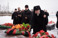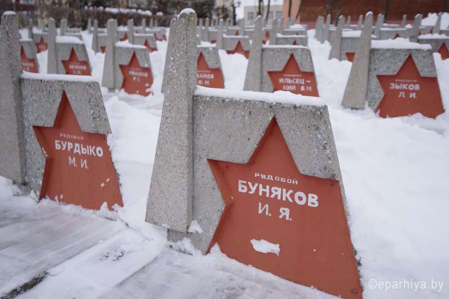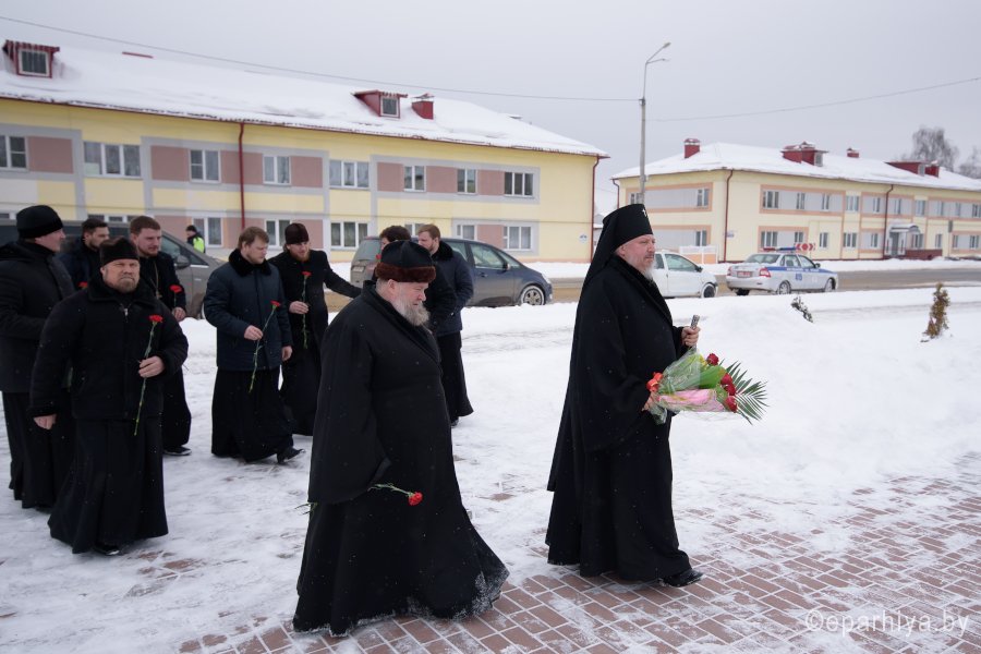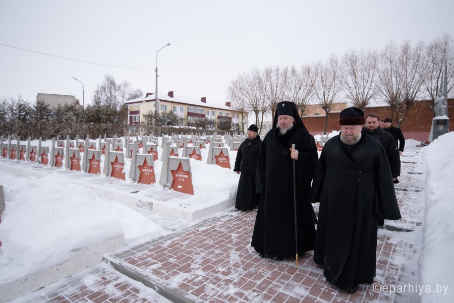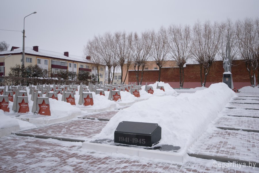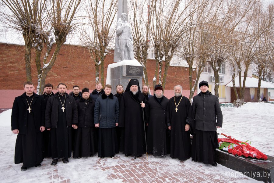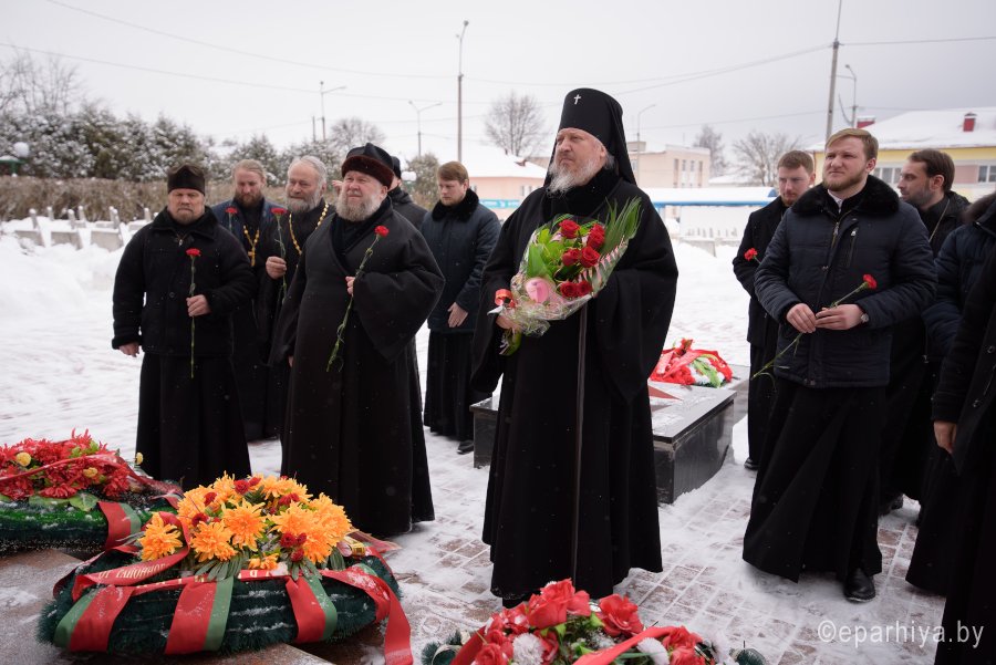 В День защитника Отечества Высокопреосвященнейший Стефан, архиепископ Гомельский и Жлобинский и духовенство Буда-Кошелевского округа возложили цветы к братской могиле воинов, погибших в ходе Великой Отечественной войны. Мемориал, или братская могила советских воинов и партизан, находится в центре города Буда-Кошелево. Здесь похоронено 253 воина и партизана, которые погибли в октябре-декабре 1943 года при освобождении района от немецко-фашистских захватчиков. В 1951г. году из п. Отчаянный сюда же был перезахоронен генерал-майор Николай Андреевич Прищепа. В 1960 году на могиле установлен памятник-скульптура воина и надмогильная плита с известными именами тех, кто погиб. В 1990 году памятник был расширен. Для каждого похороненного установлена стела, на мраморной подставке установлена скульптура воина, вечный огонь. |