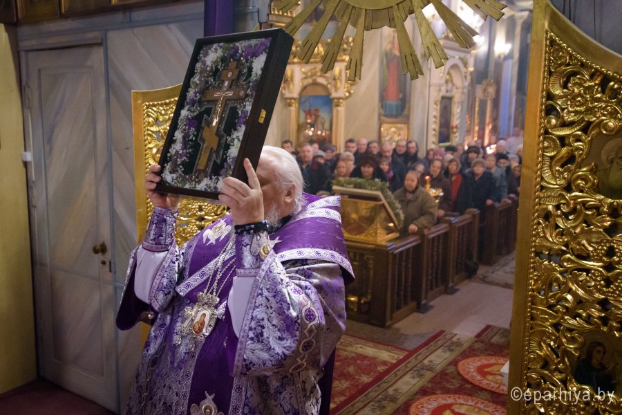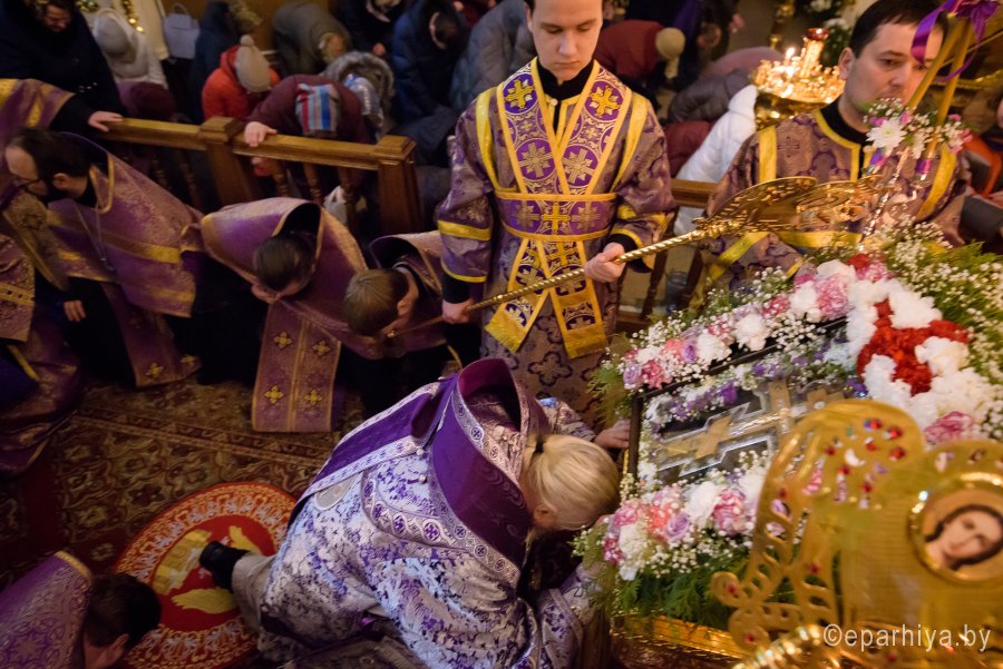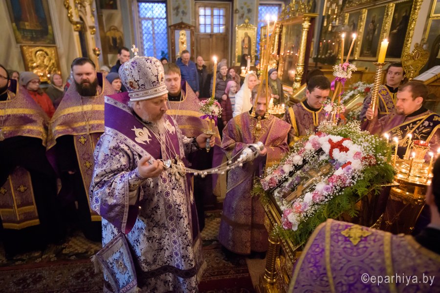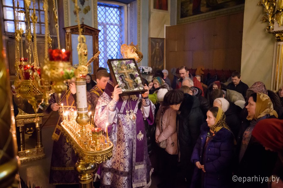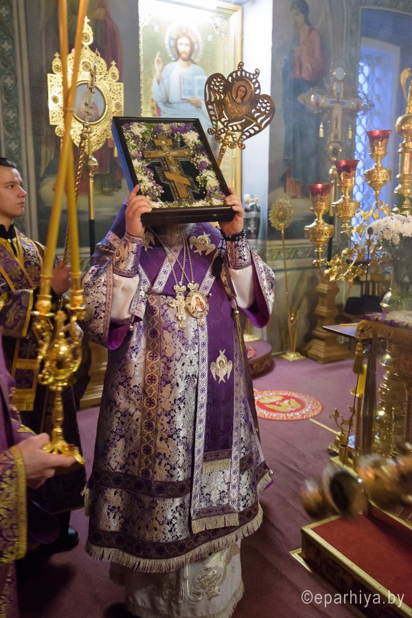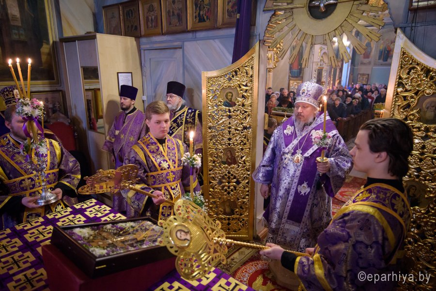 Всенощное бдение с чином выноса Креста в канун Недели третьей Великого поста, Кретоспоклонной 10 марта 2018г. Высокопреосвященнейший Стефан совершил в Свято-Петро-Павловском кафедральном соборе г.Гомеля. Высокопреосвященейшему сослужили: секретарь Гомельской епархии протоиерей Георгий Алампиев и духовенство собора. По окончании богослужения Владыка обратился к молящимся со словами Архипастырского назидания. «В субботу третьей седмицы Великого поста, во время Всенощного бдения после великого славословия из алтаря на середину храма выносится Крест, которому поклоняются православные христиане. При поклонении Кресту Церковь поет: «Кресту Твоему покланяемся, Владыко, и святое воскресение Твое славим». Эта песнь поется и на Литургии вместо «Трисвятого». Церковь выставляет в середине Четыредесятницы верующим Крест для того, чтобы напоминанием о страданиях и смерти Господней воодушевить и укрепить постящихся к продолжению подвига поста, напомнить всем верующим о том, что путь к Воскресению лежит именно через Крест и спасение души невозможно без борьбы с грехами и страстями, без скорбей и страданий. Обратно в алтарь Крест уносится в пятницу четвертой седмицы Великого поста.» |