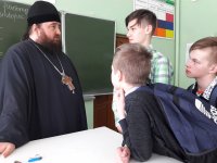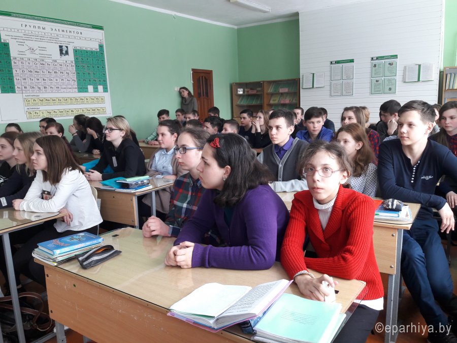 Православная книга учит молодого человека добру, милосердию, состраданию, воспитывает в нем любовь к Отечеству и родному очагу, позволяет увидеть мир во всем его многообразии и понять смысл жизни. Сегодня очень важно понять, что молодое поколение должно знать свою духовную традицию, основанную на христианских ценностях, могло разбираться в жизненных реалиях современного общества. В государственном учреждении образования «Средняя школа №7 г. Жлобина» состоялась встреча учащихся 7-8 классов с настоятелем прихода храма святого мученика Иоанна Воина иеромонахом Кронидом (Печевистым). Целью этой встречи была беседа о событии издания первой книги, и носила духовно-просветительский характер. Ребята с большим интересом выслушали священника и задавали ряд вопросов. По окончании встречи иеромонах Кронид (Печевистый) пригласил учащихся на экскурсию в храм. |