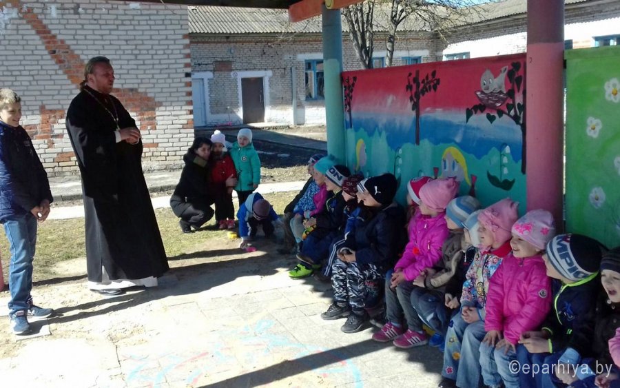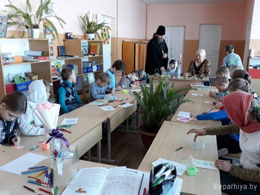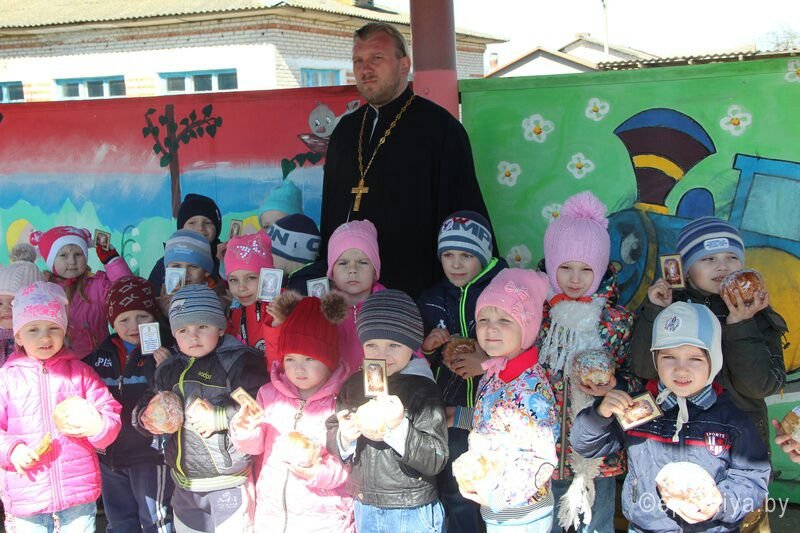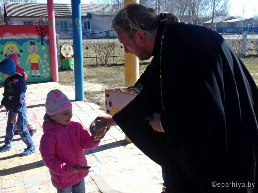 В дни празднования самого главного Православного праздника — Пасхи, которые продлятся до его отдания 20 мая, в Добрушском благочинии кроме праздничных богослужений проводятся разнообразные концертные и игровые программы, творческие мастерские, выставки, духовно-нравственные беседы и экскурсии, благотворительные акции и дружеские чаепития — всё, что позволяет почувствовать радость праздника. 8 апреля 2018 года, в праздник светлого Христова Воскресения, протоиерей Василий Грек, настоятель храма Святителя Николая Чудотворца а.г. Ленино Добрушского района, посетил 7-ю пограничную заставу «Круговец-Калинино» в/ч 1242 Гомельской пограничной группы, где провёл беседу с военнослужащими о жизни, смерти и Воскресении Господа нашего Иисуса Христа. Во время разговора личный состав во главе со старшим лейтенантом Яцевичем А.А. задавали много вопросов о православной вере, и в частности о том, как себя вести с верующими других конфессий. После чего священнослужитель угостил всех Пасхальными куличами и яйцами, было организовано праздничное чаепитие. Пограничников г.п. Тереховка поздравил с Пасхой иеромонах Венедикт (Мажуко). В храме святого Архангела Михаила г.п. Тереховка, где он является настоятелем, в святой День Пасхи в 11.00 состоялось детское Пасхальное богослужение. Священнослужитель считает важнейшим в своей работе внимание к детям. Сам он еженедельно вот уже в течение нескольких лет окормляет поселковую школу, проводит занятия с подростками. Вверенный ему храм всегда наполнен детьми. После совершения детской совместной молитвы иеромонах Венедикт (Мажуко) навестил молодежь из учреждения для инвалидов «Семейный дом-2000» в Климовке. Он частый и желанный гость в этом социальном учреждении. Регулярно совершает духовное окормление ребят, организует концерты музыкальных коллективов из Гомеля, делает подарки. В этом году он поздравил всех жителей г.п. Тереховка с праздником Пасхи, пригласив их в Светлую субботу в поселковый Дом культуры. Там своими музыкальными номерами их порадовали артисты из областного центра. Без внимания священнослужителя не остались и школьники из д. Уть. Иеромонах посетил утренник в учебном заведении, где разделил радость праздника вместе с детьми. Иерей Виталий Дерели, настоятель храма Святой Живоначальной Троицы а.г. Крупец, в Светлый Понедельник поздравил с праздником своих сельских школьников: провел пасхальные беседы с ребятами начиная от самых маленьких — воспитанников местного детского сада и младших школьников, до старшеклассников. Всем подарил иконки и освященные куличи. Священнослужитель не оставил без внимания и более почтенный возраст: навестил одиноких инвалидов агрогородка, поздравил, подарил куличи и иконы. Акция «Кулич на ладошке» проводится в благочинии не первый год. Большая радость передавать освященные куличи и яйца, пожертвованные прихожанами, а также мясные изделия и сладости тем, кто в силу возраста или по состоянию здоровья не смог посетить Богослужение в храме в этот праздник. Акция «Кулич на ладошке» прошла еще в г. Добруше, д. Нивки и д. Борщовка. Протоиерей Иоанн Стаськов, настоятель храма святого Архангела Михаила в д. Борщовка, также встречался со школьниками. После беседы в школе ребята направились в храм, где состоялась увлекательная экскурсия. С учениками а.г.Ленино празд