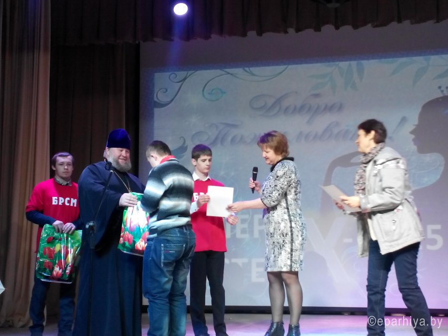 По благословению Преосвященнейшего Стефана, епископа Гомельского и Жлобинского 20 марта 2015 г. протоиерей Сергий Пешко, благочинный Буда-Кошелевского района принял участие в межрайонном конкурсе среди инвалидов «Мистер Икс». Протоиерей Сергий торжественно вручил главный приз победителю конкурса, поблагодарил и наградил всех участников за представление и пожелал всем собравшимся крепкого здоровья и Божией помощи в трудах. |
