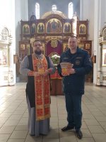 В рамках республиканской пожарно-профилактической акции «За безопасность вместе» 18 апреля в храме Преображения Господня в г. Светлогорске прошла встреча прихожан храма с заместителем начальника Светлогорского РОЧС по идеологической работе и кадровому обеспечению майором внутренней службы Пинчуком Евгением Николаевичем. Прихожанам были вручены информационно-просветительские буклеты с изображением иконы Божией Матери «Неопалимая Купина» и проведена профилактическая беседа о соблюдении правил пожарной безопасности. |