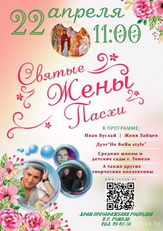 В рамках Пасхального Фестиваля Гомельской епархии в храме Преображения Господня г.Гомеля 22 апреля 2018г. состоится традиционный благотворительный концерт в честь праздника Жен-Мироносиц. Концерт начнется после праздничной Божественной литургии, которую возглавит архиепископ Гомельский и Жлобинский Стефан. В концертной программе примут участие творческие коллективы, самодеятельные и профессиональные исполнители.На открытой площадке храма Преображения Господня выступят дуэт "НеБоян style", Женя Зайцев, учащиеся среднеобразоватльных школ, а кульминацией праздника станет выступление лауреата многочисленных фестивалей и конкурсов Ивана Буслая. Мироносицы - это те самые женщины, которые из любви к Иисусу Христу принимали его в своих домах, а позже последовали за ним к месту распятия на Голгофу. Они были свидетельницами крестных страданий Христа, а также первыми узнали, что Христос воскрес. Поэтому в Православной церкви третья неделя по Пасхе носит название Недели жен-мироносиц - день памяти этих святых женщин. В пятнадцатый день по Пасхе, в нынешнем году это 22 апреля, церковь чтит первых благовестниц и отмечает этот день как праздник всех женщин-христианок. Этот день, а также неделя после него являются церковным женским праздником, когда родственники, друзья и дети поздравляют своих близких женщин - супруг, матерей, сестер. |