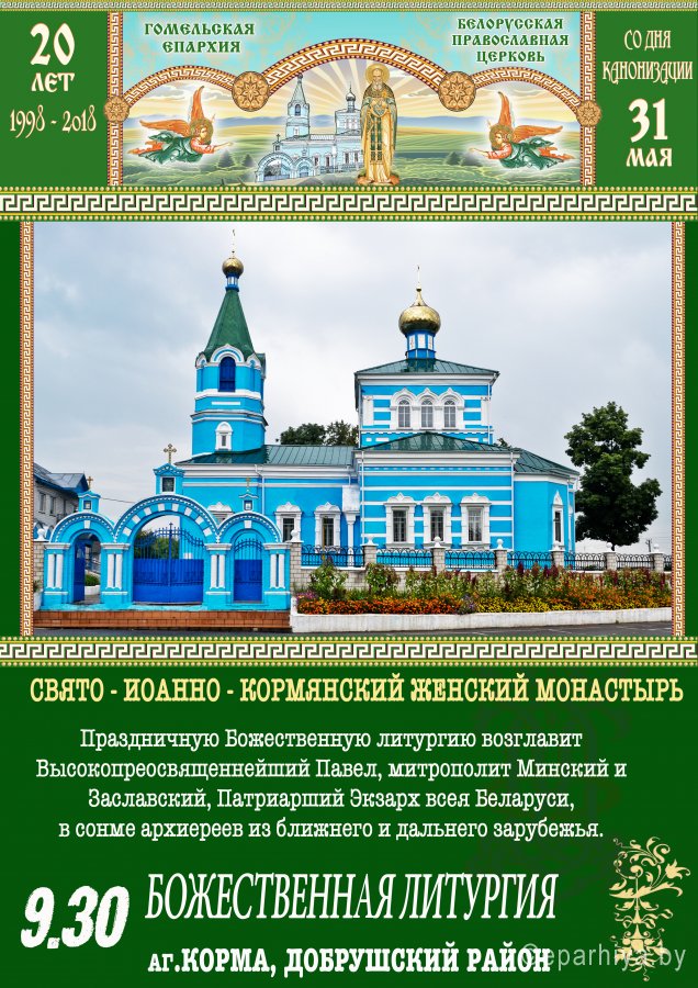 31 мая 2018 года исполняется 20 лет со дня канонизации подвижника веры и благочестия праведного Иоанна Кормянского к лику местночтимых святых Синодом Белорусского экзархата в 1998 г. Торжества пройдут 31 мая в Свято-Иоанно-Кормянском женском монастыре в аг. Корма Добрушского района. Начнутся мероприятия в 9:30 Божественной литургией, которую возглавит Высокопреосвященный Павел, митрополит Минский и Заславский, Патриарший Экзарх всея Беларуси в сослужении сонма архиереев из Беларуси и стран ближнего зарубежья. В ходе работы Архиерейского Собора 2017г., рассмотрев материалы, касающиеся общецерковного прославления почитаемых в Беларуси как местночтимых святых, было принято решение об общецерковном прославлении праведного Иоанна Кормянского (Гашкевича; †1917). |