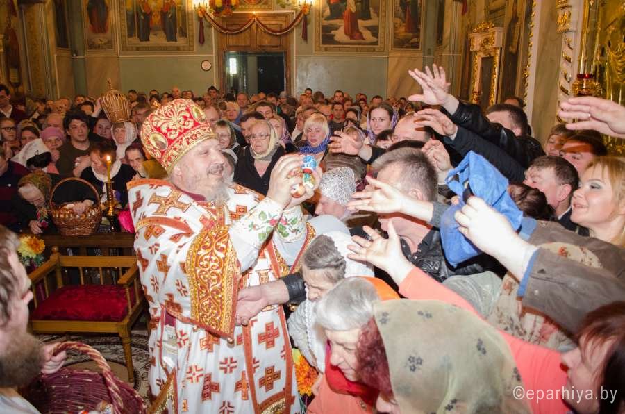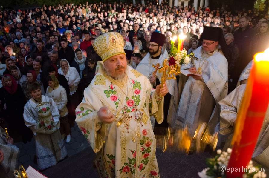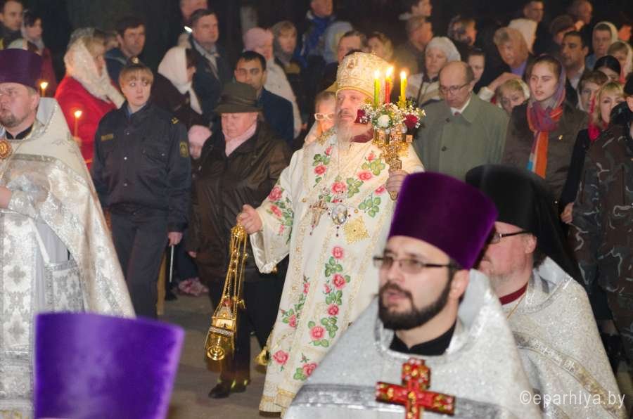 В пасхальную ночь 12 апреля 2015 года, в кафедральном соборе первоверховных апостолов Петра и Павла г.Гомеля Преосвященнейший Стефан, возглавил праздничные богослужения традиционные для Пасхи Христовой: полунощницу, крестный ход, заутреню и Божественную Литургию свт. Иоанна Златоуста. Владыке сослужили: секретарь Гомельской епархии протоиерей Георгий Алампиев и духовенство собора. По завершению службы были зачитаны пасхальные послания Святейшего Патриарха Кирилла и Патриаршего Экзарха всея Беларуси митрополита Павла. |