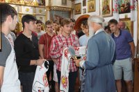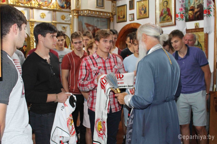 Команда хоккейного клуба "Гомель-2" и тренерский состав, во главе с главным тренером команды Магдеевым Владимиром посетила храм Георгия Победоносца в г.Гомеле. Настоятель прихода протоиерей Димитрий Гончаров отслужил молебен перед началом сезона, окропил всех святой водой, провел беседу о таинствах церкви и здоровом образе жизни, пожелал ребятам Божьей помощи и побольше побед, а затем освятил автобус команды. Капитан команды поблагодарил священнослужителя за молитву, за теплые слова и вручил шарф и майку с логотипом команды. |