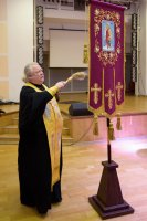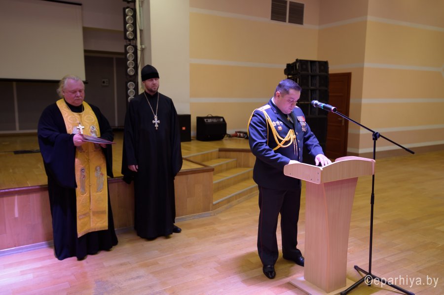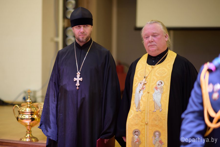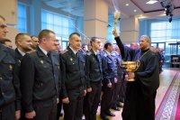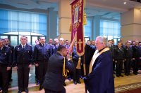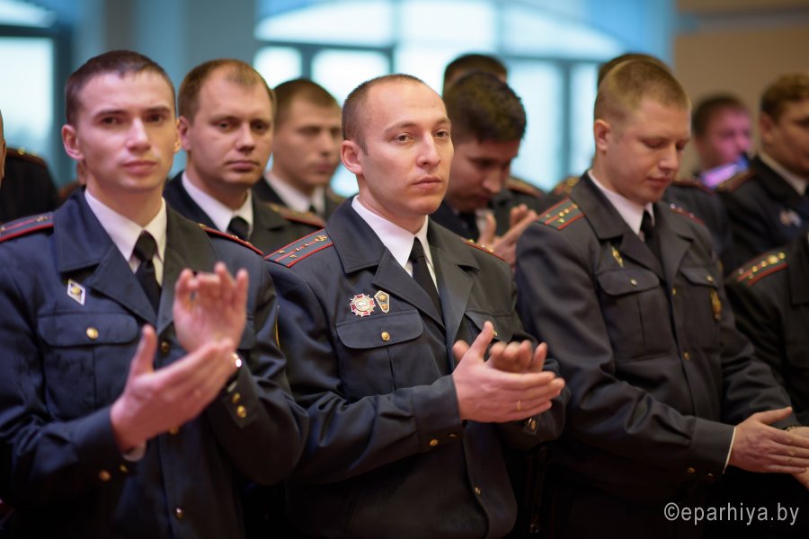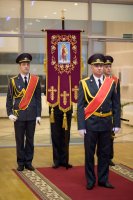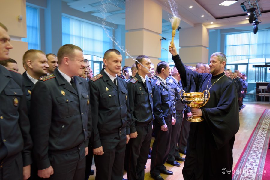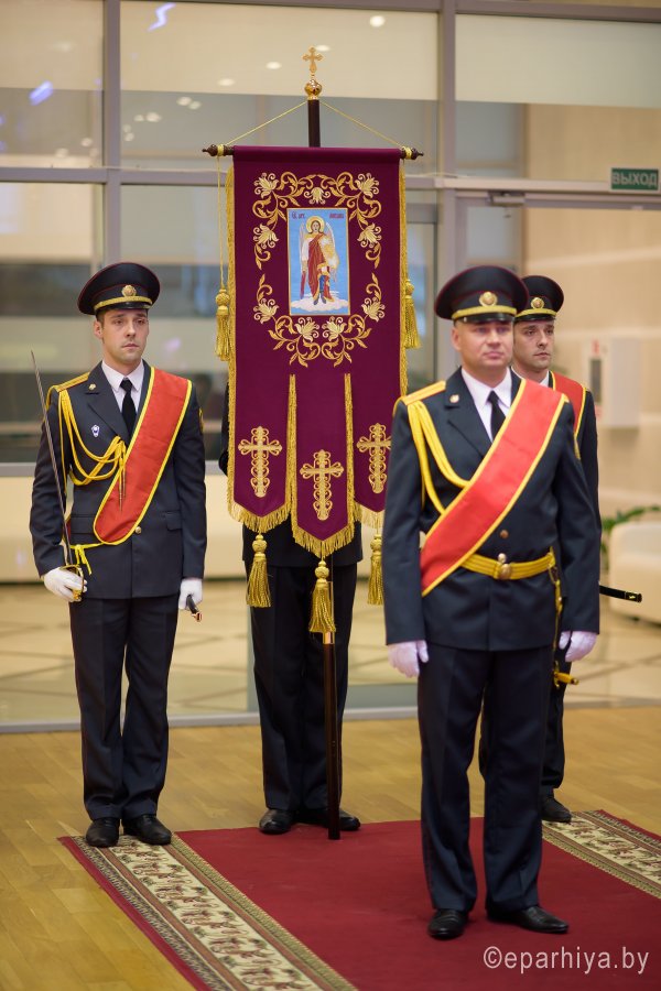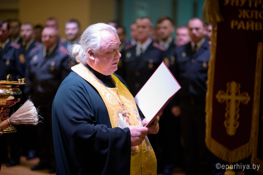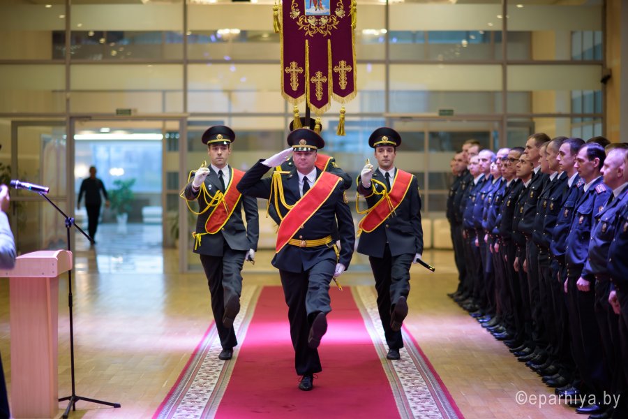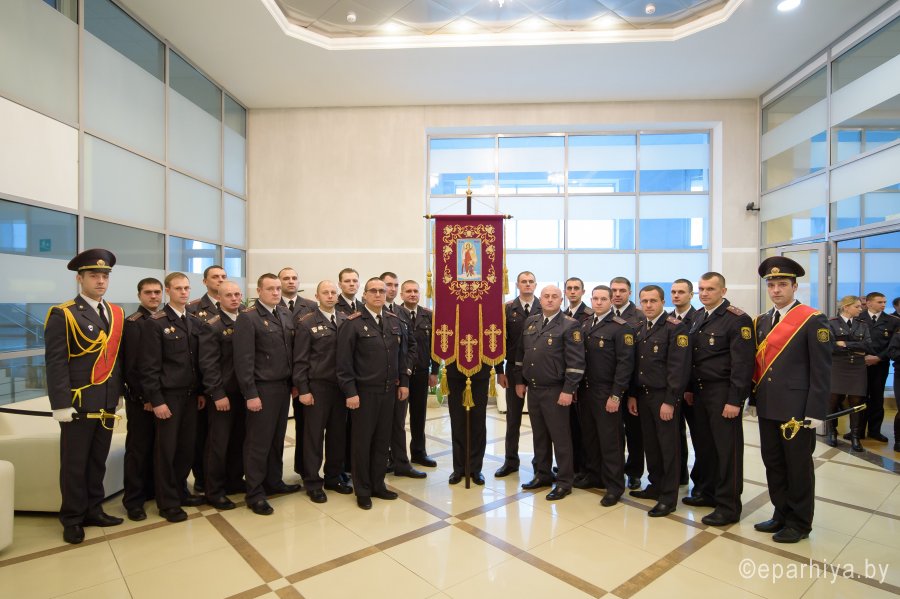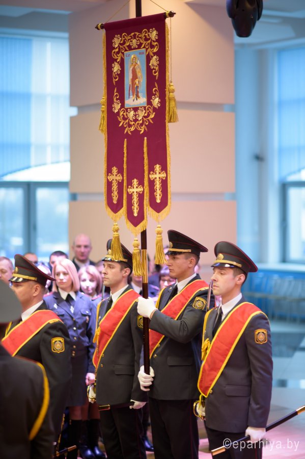 В рамках мероприятий, приуроченных к 100-летию создания отдела внутренних дел Жлобинского райисполкома особое место заняла торжественная церемония вручения отделу духовного боевого знамени – хоругви. Хоругвь, на которой изображается образ Иисуса Христа, Богородицы или святых, символизирует духовное покровительство высших небесных сил. В данном случае под покровом будут находиться работники милиции, которые круглосуточно несут боевое дежурство по охране спокойствия жлобинчан, нередко при этом подвергая опасности свои жизни. 23 ноября 2018 года, по благословению архиепископа Гомельского и Жлобинского Стефана протоиерей Владимир Масалитин передал для отдела хоругвь, а благочинный Жлобинского округа протоиерей Василий Пилипенко соверщил чин освящения хоругви. Он пожелал Жлобинским милиционерам крепости духа и мужества при выполнении своего служебного долга. В мероприятии приняли участие начальник ОВД райисполкома полковник милиции Геннадий Мельник, сотрудники отдела. На церемонию были приглашены и ветераны милиции. Освящённое боевое знамя займёт почётное место в музее истории райотдела милиции, открытого к 100-летнему юбилею Жлобинской милиции. |