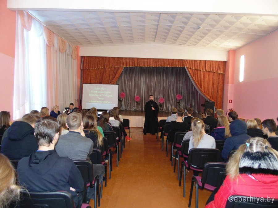 30 ноября 2018 года в рамках проведения Всемирной кампании против СПИД и Всемирного дня борьбы со СПИДом, а также с целью активизации работы по пропаганде здорового образа жизни на базе ГУО «Средняя школа №1 города Добруша» прошел классный час с учащимися старшего возраста. Мероприятие провел помощник благочинного по социальному служению иерей Максим Плисков. В своем обращении к старшеклассникам священнослужитель заметил, что зависимости и страсти повреждают душевное и телесное здоровье человека, приводят к болезни и, в итоге, к смерти. Что невероятно тяжело бывает освободиться от вредных привычек. В этот же день в ГУО «Средняя школа №5 города Добруша» прошел круглый стол, приуроченный Всемирному дню борьбы со СПИДом, на котором с учащимися 8-11 классов беседовали медицинские специалисты и священник Алексей Митрофанов, помощник благочинного по религиозному образованию и катехизации. Священник призвал молодых людей внимательно относиться к своему душевному и телесному здоровью. |