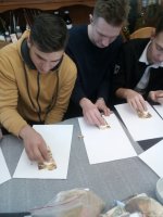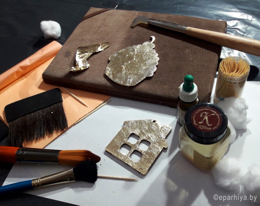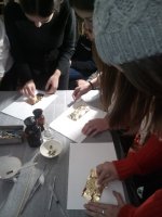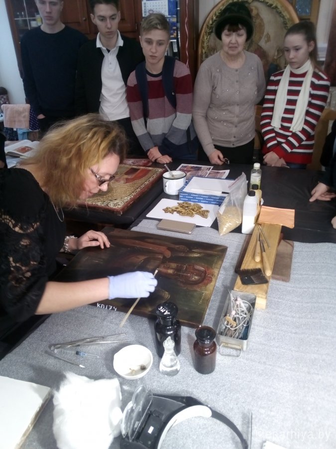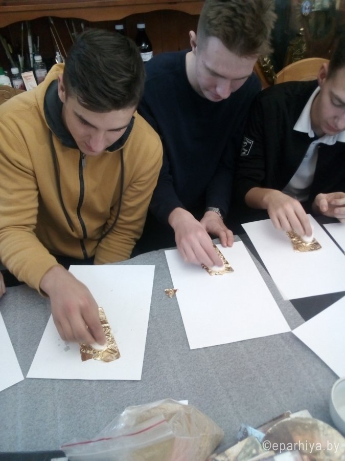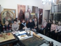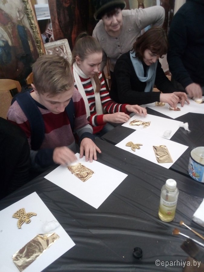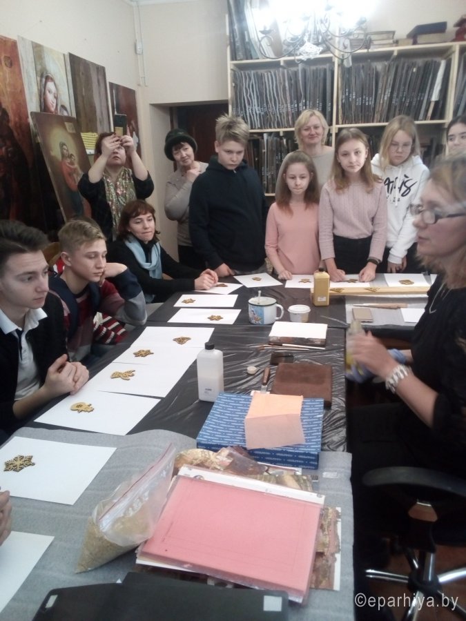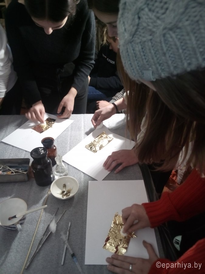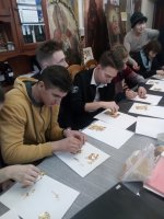 В реставрационных мастерских Гомельской Епархии был проведен мастер-класс на тему «Профессия реставратор» со школьниками старших классов школы №21 и гостями из Петергофа, учащимися кадетского класса школы №319. Мастер-класс начался предварительной беседой о тонкостях реставрационного мастерства и в частности работы мастера золотильщика. Была рассмотрена история золочения икон в различных техниках: на полимент, на мардан, чесночное золочения. Детям были продемонстрированы инструменты для золочения икон: подушечки, кисточки - лапки, ножи для резки золота и инструменты для полировки золота - агатовые зубки. В беседе были затронуты темы смысла самой иконописи и ее отличия от живописи. Для того чтобы участники мастер-класса прикоснулись к трудоемкости самого процесса золочения, им было предложено самим позолотить заранее подготовленные фанерные заготовки в новогодней тематике. Для золочения использовалась имитация сусального золота поталь. В результате дети увезли домой чудесные рождественские сувениры сделанные своими руками. После мастер-класса дети посетили экскурсию в Свято-Петро-Павловском кафедральном соборе г. Гомеля. |