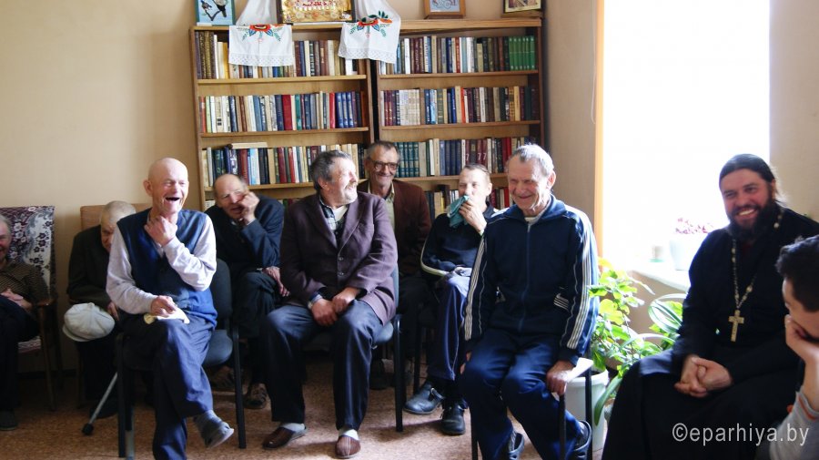2 мая 2015 г. члены молодёжного братства в честь святителя Николая совместно с иереем Андреем Булацким посетили дом престарелых в агрогородке Присно. Концерт, приуроченный к Воскресению Христову и ко Дню Победы, сопровождался щедрыми аплодисментами зрителей. Подопечные дома престарелых, многие из которых знают о войне не понаслышке, задумчиво слушали военные песни, исполняемые хором и под гитару. Некоторые из них делились своими детскими воспоминаниями о военных годах. Одинокие пожилые люди с удовольствием принимали участие в исполнении известных народных песен, а отгадывание шуточных загадок и вовсе их развеселило. Самое яркое впечатление на зрителей произвёл задорный народный танец в исполнении членов молодежного братства. А подопечные дома-интерната представили гостям частушки. В завершение встречи отец Андрей поздравил всех с праздником Победы и поблагодарил старшее поколение за возможность жить нам. |
