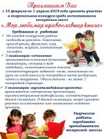 В рамках ежегодных мероприятий, посвящённых празднованию 14 марта Дня православной книги, в Гомельской епархии среди воспитанников воскресных школ будет проходить конкурс «Моя любимая православная книга», Цель данного проекта - популяризация книги и чтения как важнейших факторов в духовной жизни детей и юношества, воспитание высоких ценностных ориентаций, стимулирование родителей, педагогов и библиотекарей к активной, творческой работе по приобщению подрастающего поколения к чтению художественных произведений духовно-нравственной направленности. Конкурспроводится в двух номинациях: - сочинение; - мультимедийные проекты. в двух возрастных группах: проводиться в два этапа: С 16 февраля по 1 апреля проводиться I этап конкурса в каждом благочинии Гомельской епархии. Работы -победительницы, прошедшие во второй этап конкурса, передаются до 4 апреля 2019 г. в отдел религиозного образования и катехизации Гомельской епархии по адресу: г.Гомель ул.Баумана.16. (мультимедийные проекты на электронную почту: оroik.gomel@gmail.com) С 5 по 9 апреля проводиться IIэтап конкурса в отделе религиозного образования и катехизации Гомельской епархии. Итоги проведения конкурса будут опубликованы на сайте Гомельской епархии, победители которого будут награждены дипломами и памятными подарками от Гомельской епархии в рамках тематического мероприятия. Более подробную информацию о целях конкурса, порядке проведения и требования к работам можно найти в Положении конкурса: |