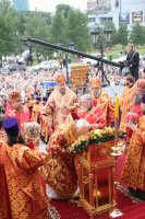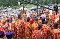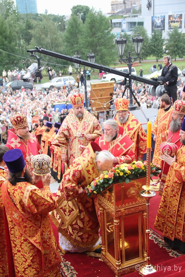 16 июля 2013г. Преосвященнейший Стефан, епископ Гомельский и Жлобинский, в сонме архиереев принял участие в богослужении в память святых Царственных Страстотерпцев в Храме-на-Крови (г.Екатеринбург, Россия). Праздничное всенощное бдение возглавил Митрополит Екатеринбургский и Верхотурский Кирилл.Царственные страстотерпцы — это последний российский император Николай II и его семья. Они приняли мученическую смерть — в 1918 году их расстреляли по приказу большевиков. В 2000 году Русская Православная Церковь причислила их к лику святых. День памяти Царственных мучеников отмечается 17 июля. Царственные страстотерпцы, Царственные мученики, Царская семья — так после причисления к лику святых Русская Православная Церковь называет последнего российского императора Николая II и его семью: императрицу Александру Федоровну, царевича Алексея, великих княжен Ольгу, Татьяну, Марию и Анастасию. Они были канонизированы за подвиг мученичества. «Страстотерпец» — это один из чинов святости. Это святой, принявший мученическую смерть за исполнение Божиих Заповедей, и чаще всего — от рук единоверцев. Важная часть подвига страстотерпца — то, что мученик не держит зла на мучителей и не сопротивляется. Именно в лике страстотерпцев были канонизированы император Николай II и его семья. Последний российский император Николай II Романов отрекся от престола 2 марта 1917 года. После отречения его вместе с семьей, врачом и слугами заключили под домашний арест во дворце в Царском селе. Потом, летом 1917-го, Временное правительство отправило узников в ссылку в Тобольск. И наконец весной 1918 года большевики сослали их в Екатеринбург. Именно там в ночь с 16 на 17 июля Царскую семью расстреляли — по постановлению исполкома Уральского областного Совета рабочих, крестьянских и солдатских депутатов. На месте дома инженера Ипатьева, в котором содержались под арестом и была расстреляна Семья был построен Храм-на-Крови во имя Всех святых, в земле Российской просиявших. Здание, в котором была расстреляна Царская семья, снесли в 1977 году. В 1990 году здесь был установлен первый деревянный крест. Вскоре на этом участке был построен временный храм. В сентябре 2000 года Святейший Патриарх Московский и всея Руси Алексий II заложил в основание храма капсулу с памятной грамотой об освящении места строительства. Здание было построено за три года. Верхний храм во имя Всех святых, в земле Российской просиявших, был освящен в канун 85-летия расстрела Царской семьи — 16 июля 2003 года. 18 апреля 2010 года нижний придел святых Царственных страстотерпцевосвятил Святейший Патриарх Московский и всея Руси Кирилл. Центральный престол нижнего храма освящен в честь святых Новомучеников и исповедников Российских. Рядом с алтарем находится главная святыня храма — крипта, расположенная на месте «расстрельной» комнаты. В оформлении крипты использовались кирпичи и камни фундамента, сохранившиеся от дома Ипатьева. Ежегодно в ночь на 17 июля в Храме-на-Крови совершается Божественная литургия, по окончании богослужения от храма до Ганиной Ямы (21 км, 4-5 часов пути) следует крестный ход (в 2012 году в нем принимало участие порядка 40 000 человек). Территория, прилегающая к Храму-на-Крови, получила официальное название «Святой квартал». Святой квартал включает в себя комплекс зданий храма и Патриаршего подворья. В храмов
